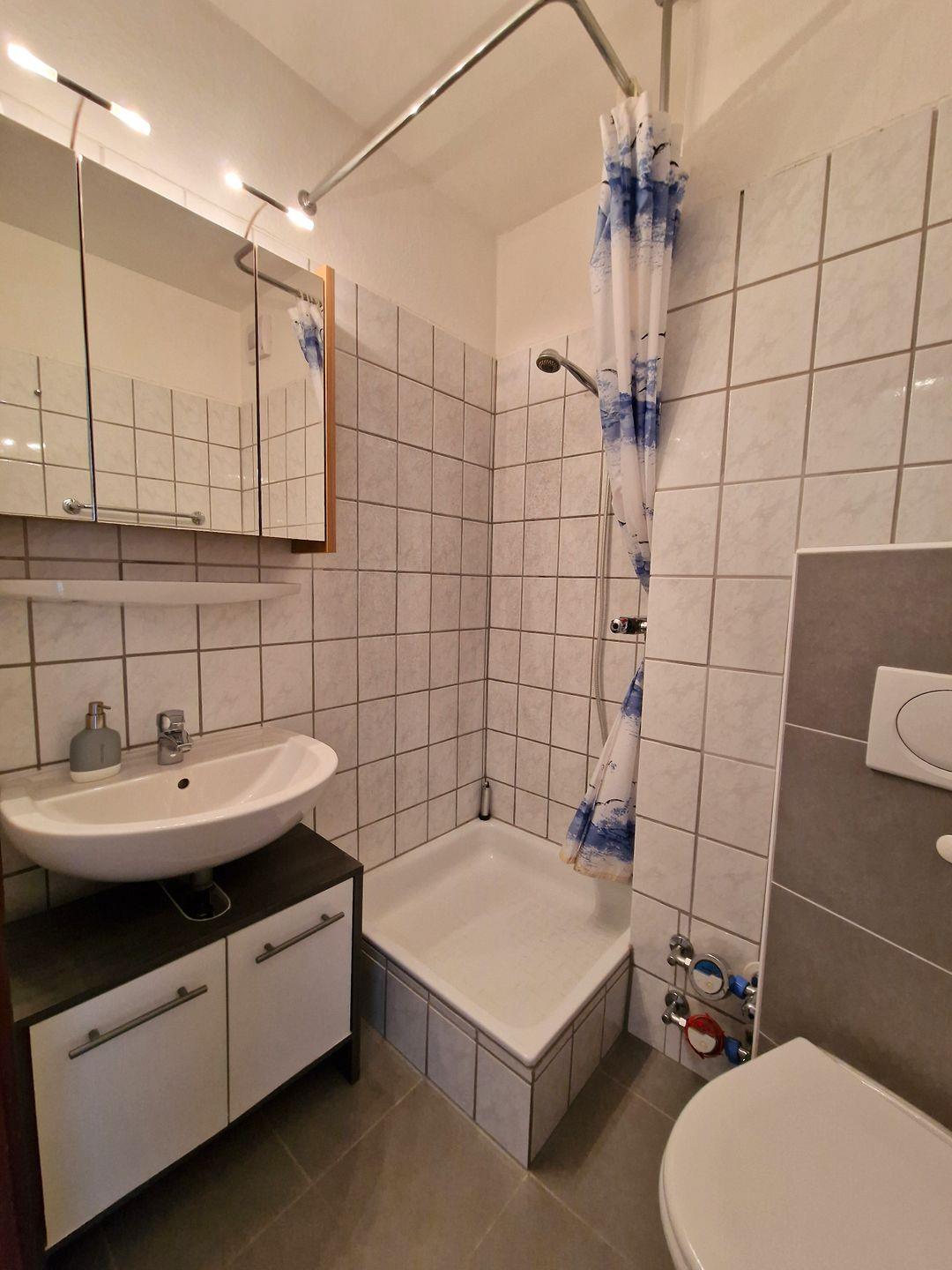 Das Badezimmer verfügt über eine Dusche, WC sowie einen beleuchteten Spiegelschrank.