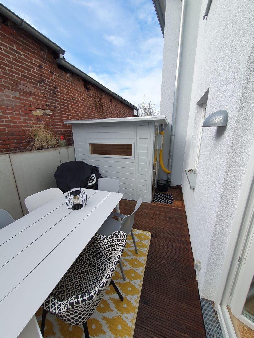 Im Erdgeschoss befinden sich ein Gäste-WC, die offene Wohnküche, eine Essecke, das Wohnzimmer mit Smart-TV sowie der Zugang zur 25 m² großen Terrasse. Die vollständig geschützte und sehr ruhige Hinterhof-Terrasse wird durch eine schöne Sauna ergänzt.
