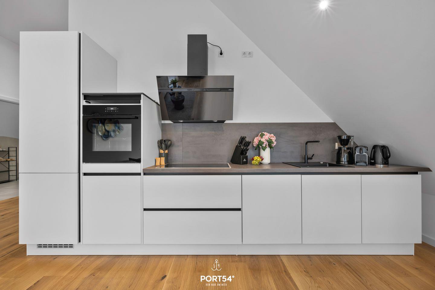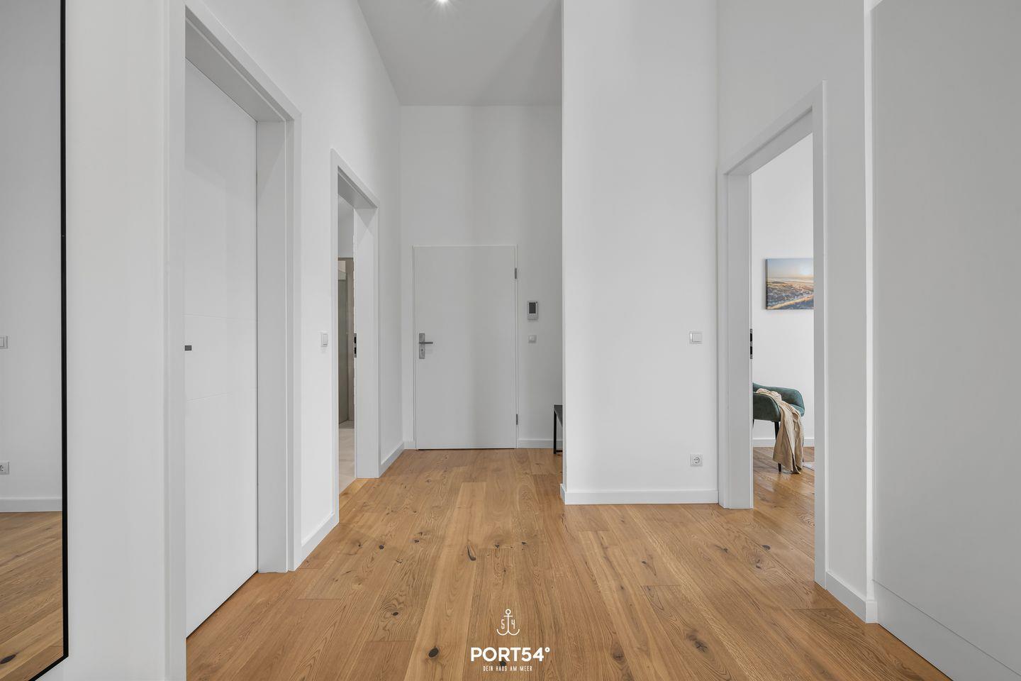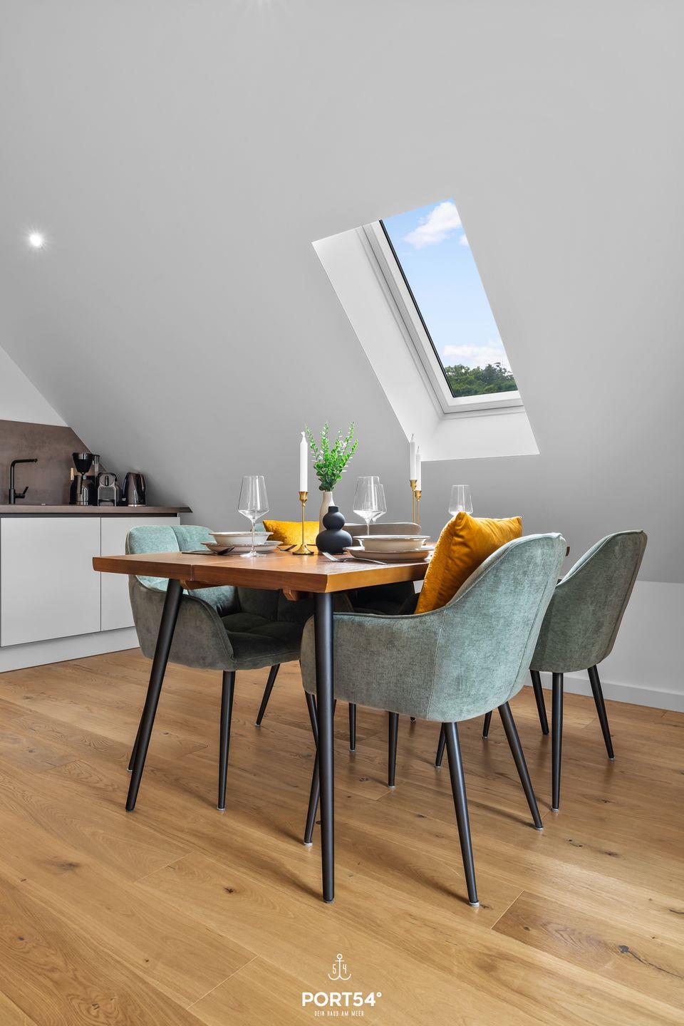 Die Wohnung verfügt über zwei gemütliche Schlafzimmer mit hochwertigen Parkettböden, die für eine erholsame Nachtruhe sorgen. Das geräumige Wohnzimmer besticht durch modernes Design und eine komfortable Couch, auf der du nach einem Tag am Strand entspannt einen Filmabend genießen kannst. Der offene Wohn- und Essbereich lädt zu gemeinsamen Mahlzeiten ein, während die voll ausgestattete Küche vom Induktionskochfeld über Backofen bis zur Spülmaschine alles bietet, um das Kochen zum Vergnügen zu machen.
