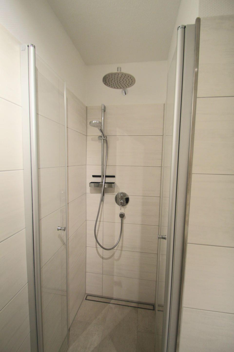 Das Badezimmer verfügt über eine bodengleiche Dusche, WC, Waschbecken und Spiegel. Warmes Wasser ist selbstverständlich vorhanden. Ein Rauchmelder sorgt für zusätzliche Sicherheit.