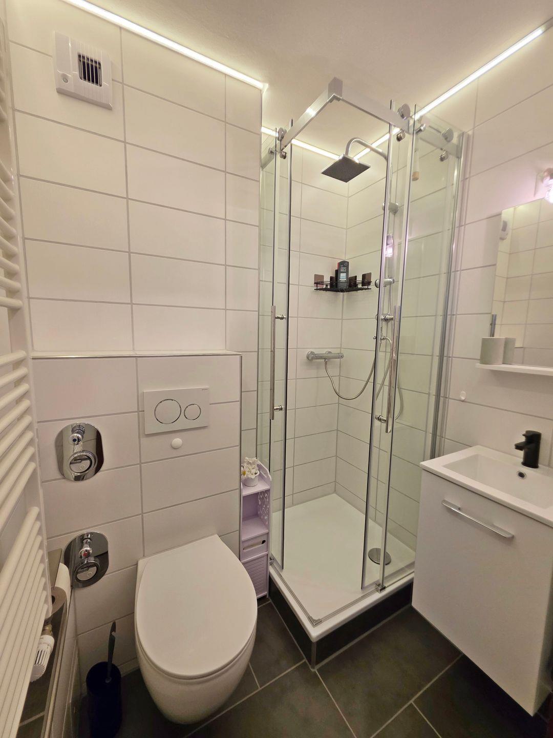 Das moderne Badezimmer hält eine Dusche mit Wanneneinstieg, ein WC, ein Waschbecken und einen großen Spiegel bereit. Warmes Wasser ist selbstverständlich vorhanden.