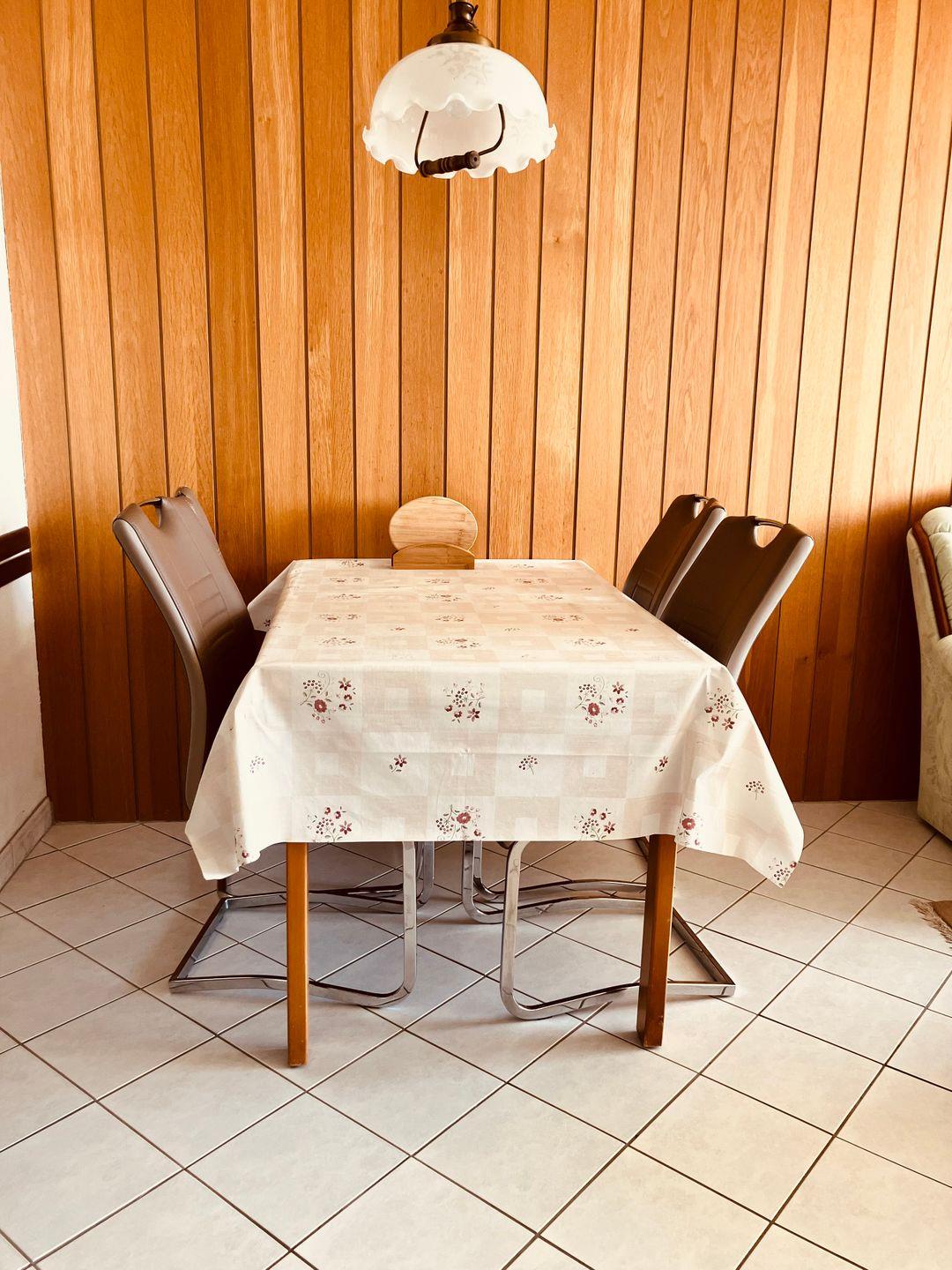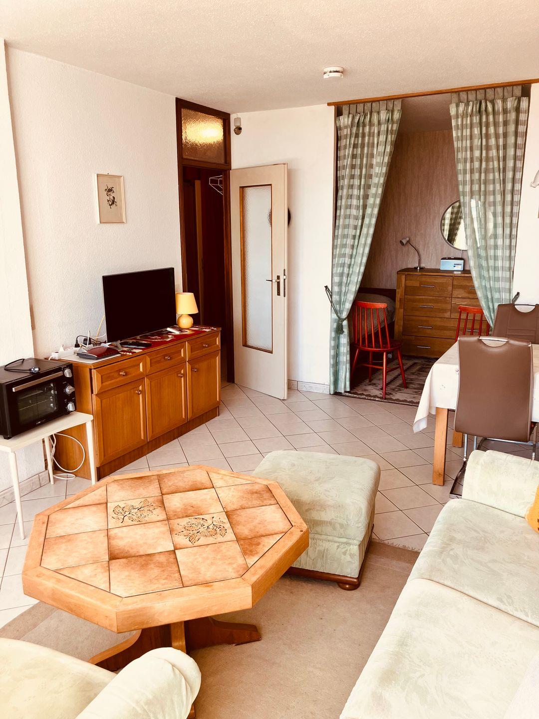 Der Wohnbereich ist klassisch eingerichtet und strahlt mit seinen warmen Holzmöbeln und hellen Farben eine behagliche Stimmung aus. Ideal für Gäste, die eine unkomplizierte und gemütliche Unterkunft schätzen.