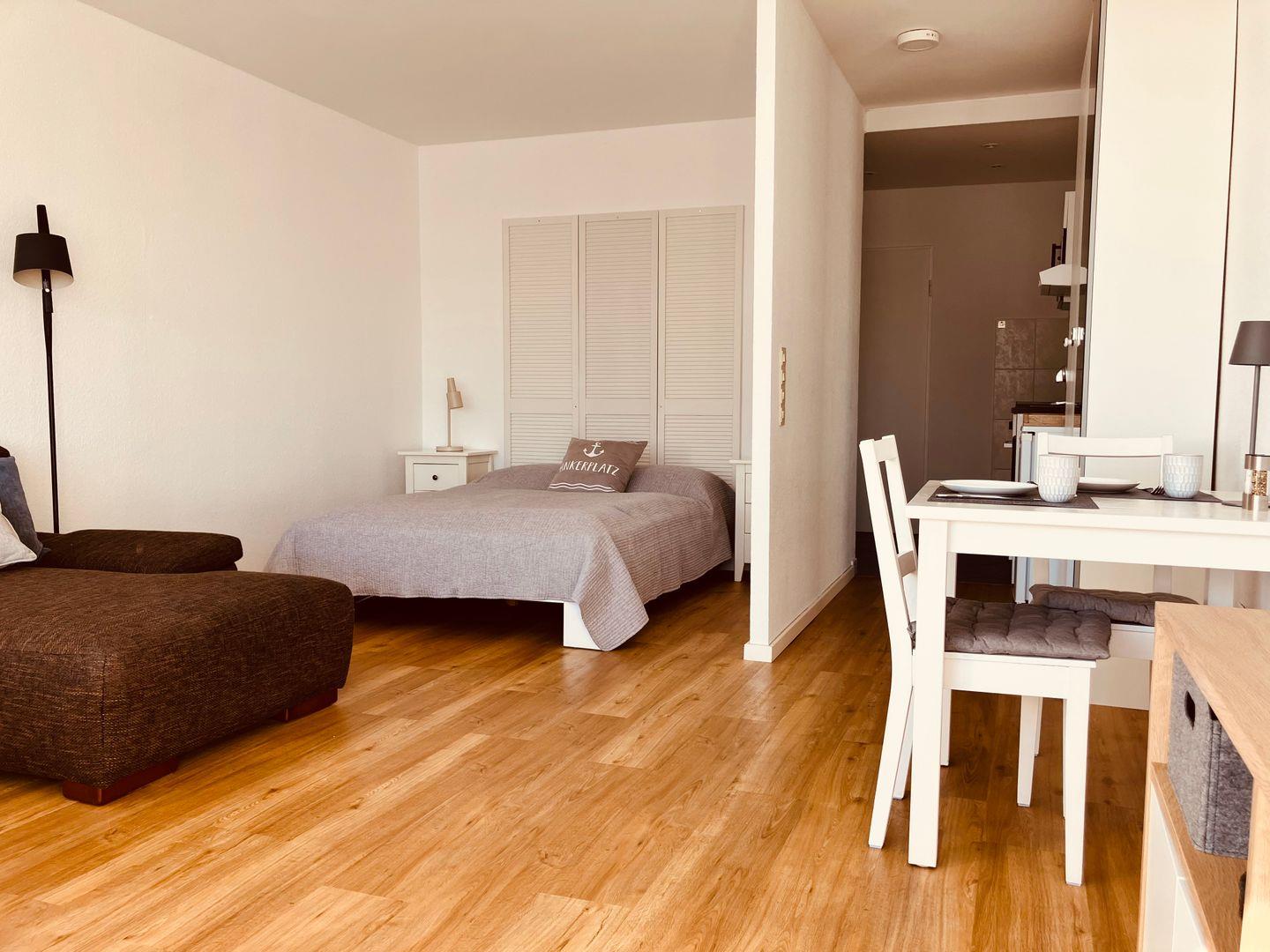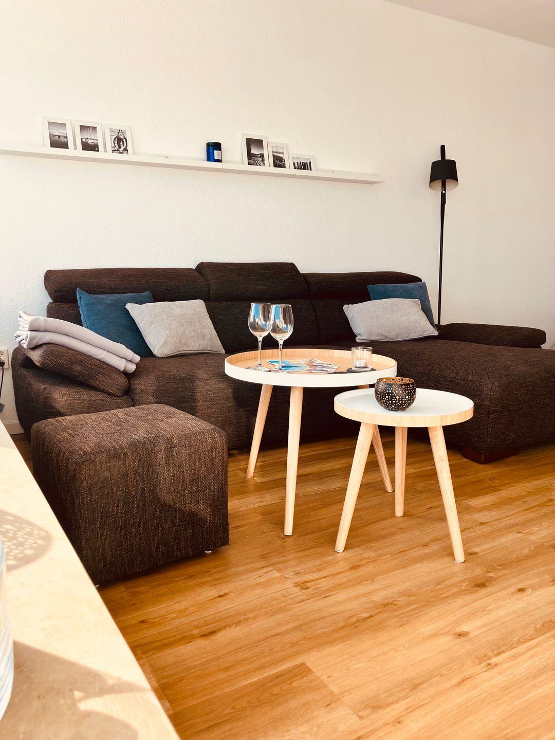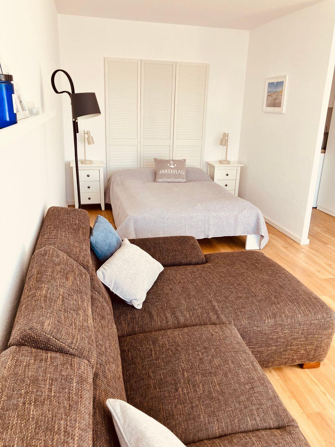 Der kombinierte Wohn- und Schlafbereich präsentiert sich modern und zugleich gemütlich. Warme Holztöne, harmonisch abgestimmte Möbel und sorgfältig ausgewählte Accessoires schaffen eine angenehme Wohlfühlatmosphäre. Besonders charmant sind die zahlreichen Bilder von Heiligenhafen, die der Wohnung eine persönliche Note verleihen und die Verbundenheit zur Region stilvoll unterstreichen.