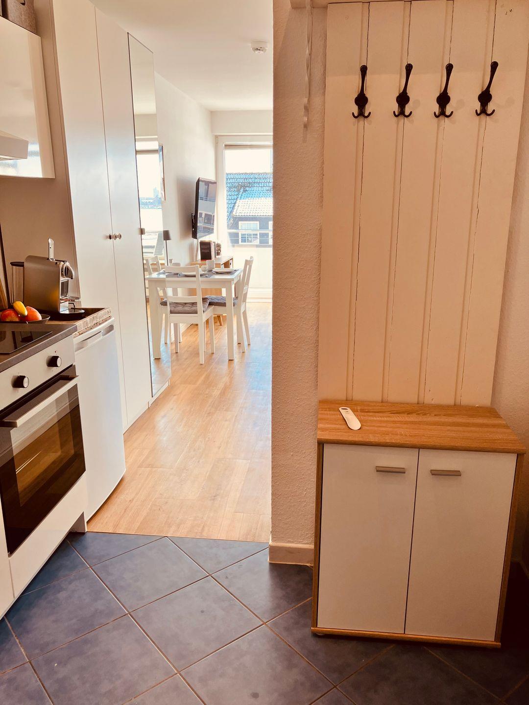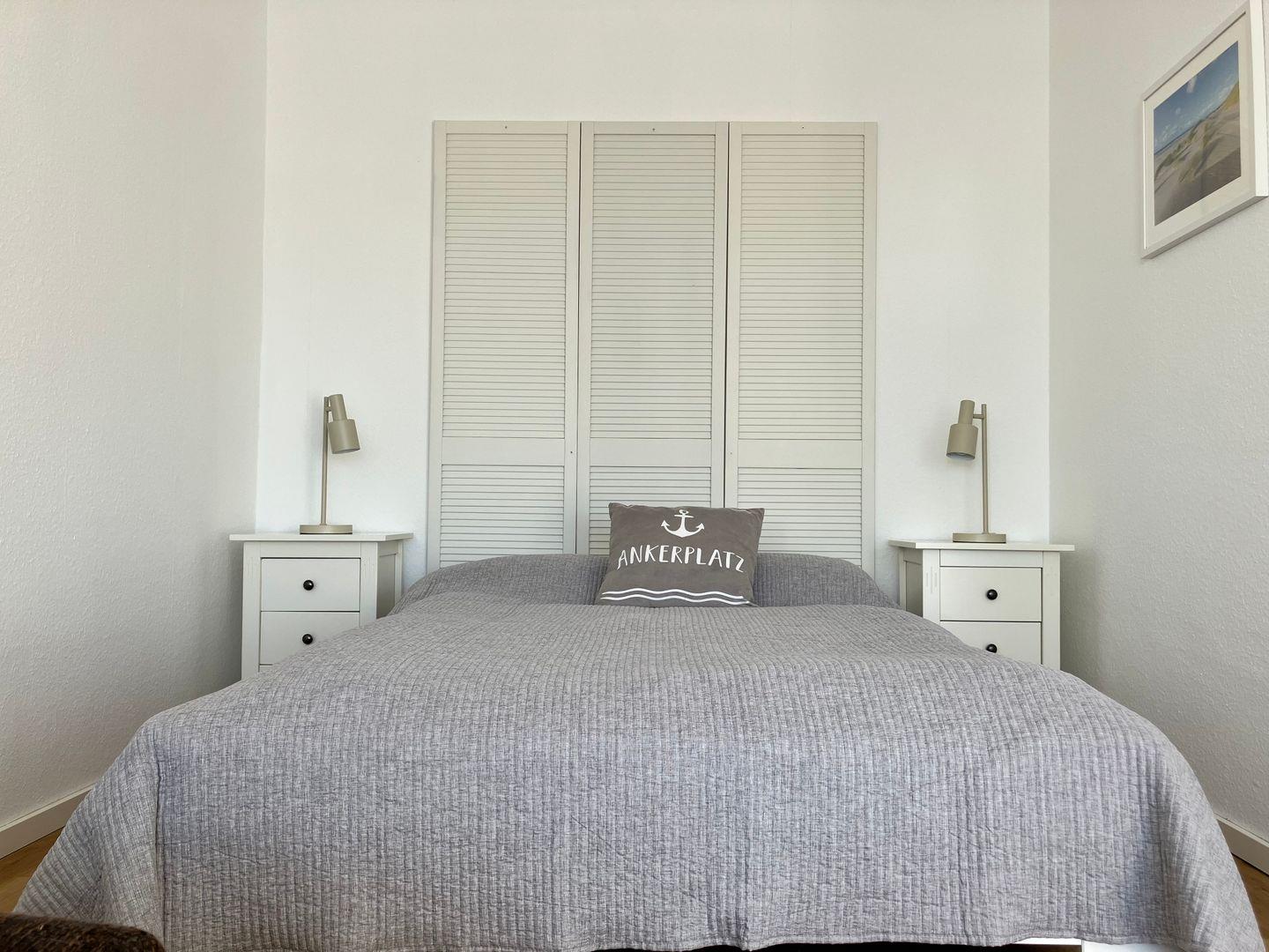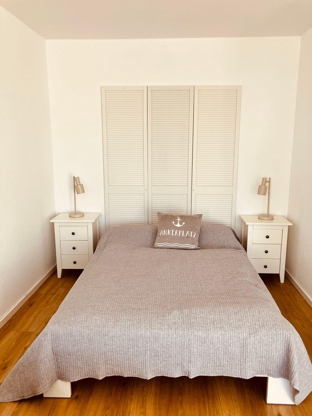 Der kombinierte Wohn- und Schlafbereich präsentiert sich modern und zugleich gemütlich. Warme Holztöne, harmonisch abgestimmte Möbel und sorgfältig ausgewählte Accessoires schaffen eine angenehme Wohlfühlatmosphäre. Besonders charmant sind die zahlreichen Bilder von Heiligenhafen, die der Wohnung eine persönliche Note verleihen und die Verbundenheit zur Region stilvoll unterstreichen.