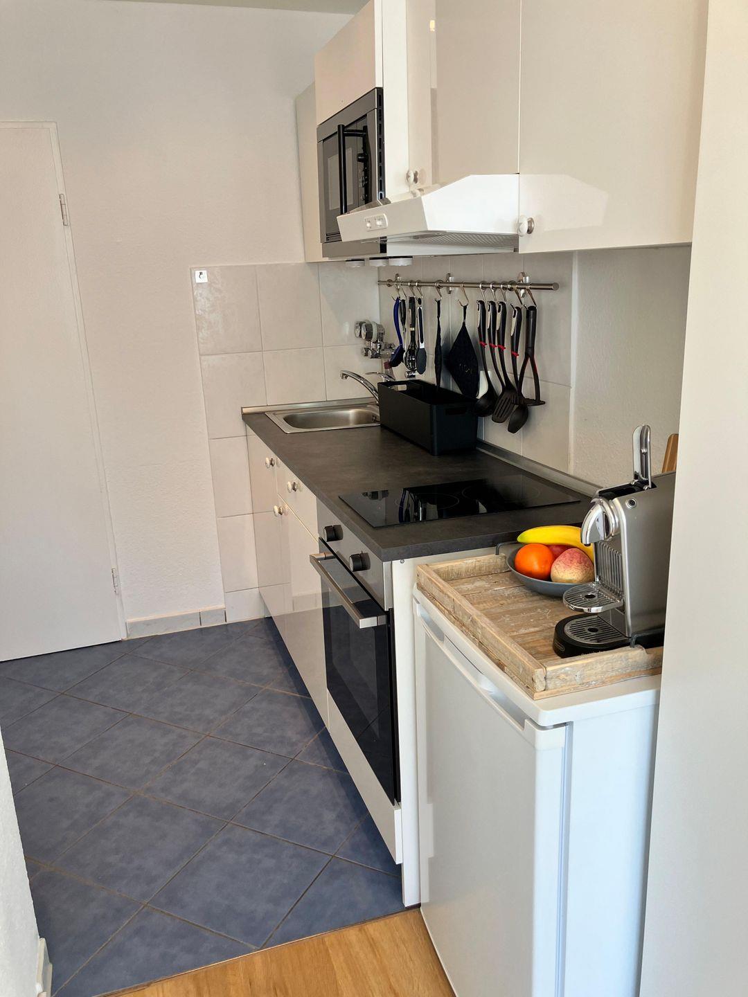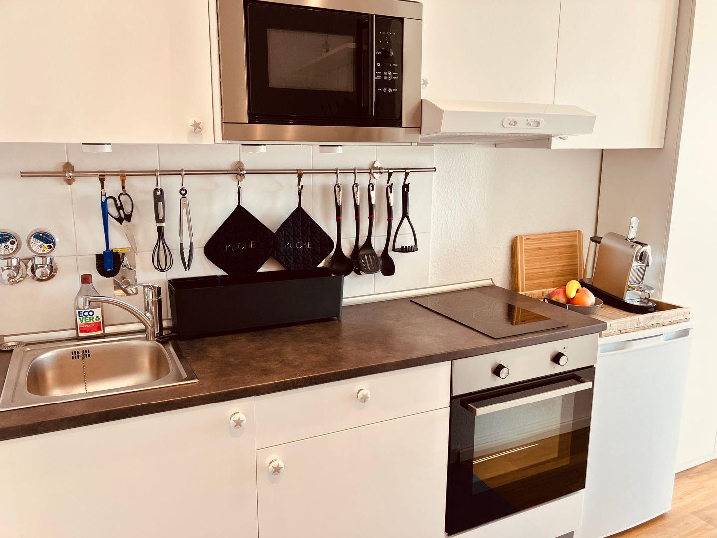 Die integrierte Küche ist gut ausgestattet und bietet alles für eine komfortable Selbstversorgung – inklusive Kochfeld, Backofen sowie Espresso- und Kaffeemaschine. Der Essbereich lädt zu gemeinsamen Mahlzeiten in entspannter Atmosphäre ein.