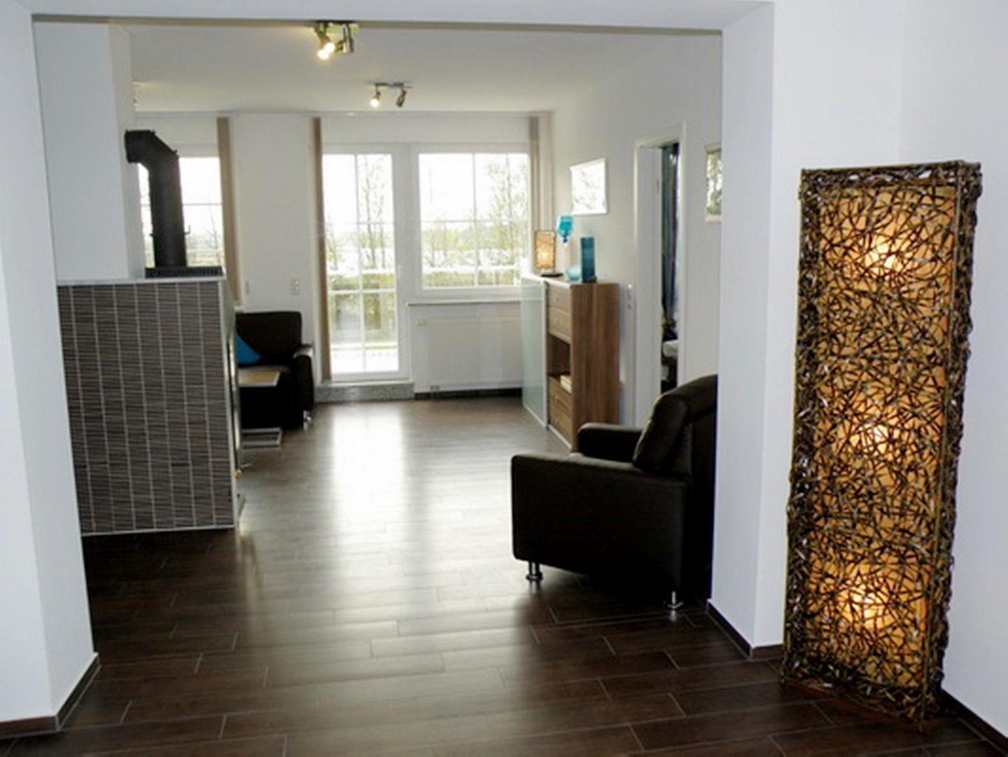 Wohnzimmer mit Ledercouch u. 2 Sesseln, 55"-LCD-TV, Kaminofen, Balkon zur Westseite/Naturschutzgebiet. Offener Küchenbereich mit 4er-Ceranfeld, Backofen, Geschirrspüler, Mikrowelle, Kühlschrank mit Gefrierfach, Dolce-Gusto-Kaffeemaschine, angeschlossener Essbereich mit moderner Eckbank, 2ter LCD-TV, Stühlen und Tresen mit Barhockern. Balkon zur Nord/Ostseite mit Blick auf die Ostsee. 2 sep. Schlafzimmer mit Doppelbett und Kleiderschrank. 2 Bäder mit Dusche und eins davon mit direktem Zugang zur Sauna. Münz-Waschmaschine und - Trockner im Keller. Garage. Nichtraucher, Tierhaltung auf Anfrage. Silvester keine Vermietung unter 5 Nächten möglich!