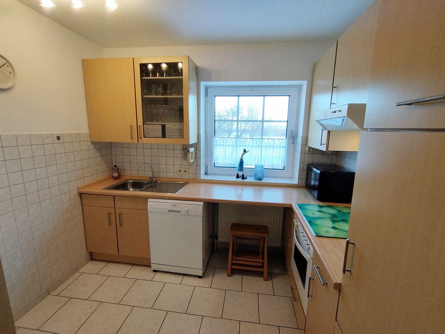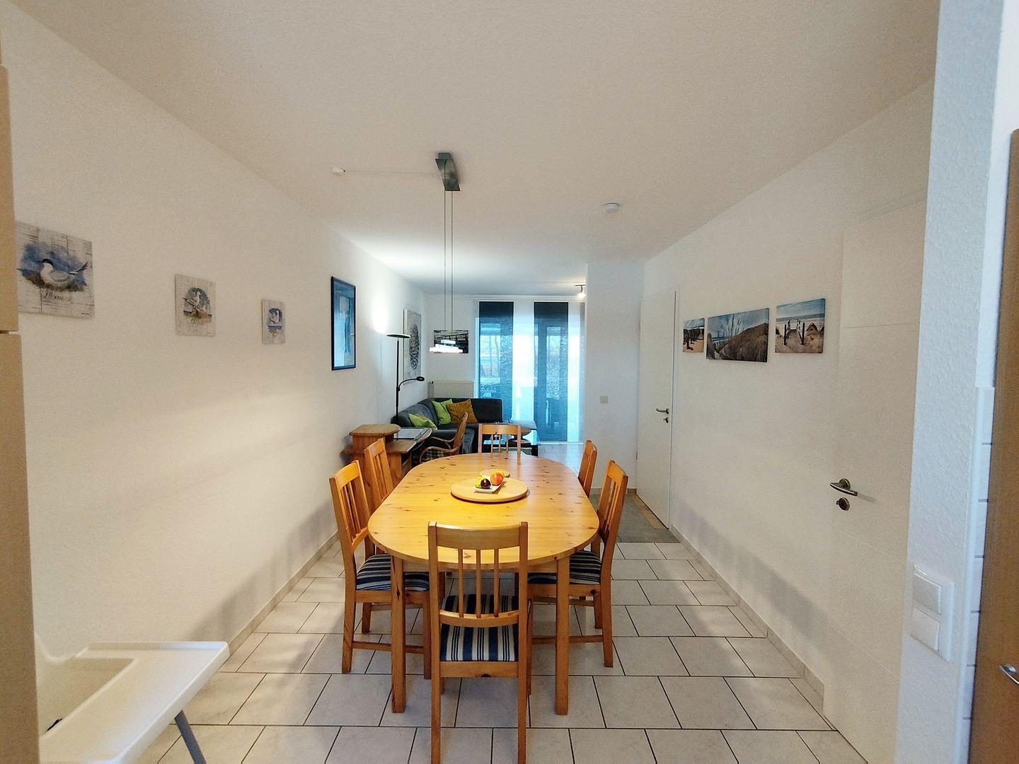 Die buchefarbene Einbauküche ist mit Ceranherd, Backofen, Geschirrspüler, Kühlschrank mit Gefrierfach, Microwelle, Geschirr und umfassenden Zubereitungsgeräten für Ihren Urlaub ausgestattet. Am großen Esstisch finden 6 Personen die Möglichkeit gemeinsame Mahlzeiten oder Spieleabende zu genießen. Ein zusätzlicher Kinderhochstuhl steht bereit.