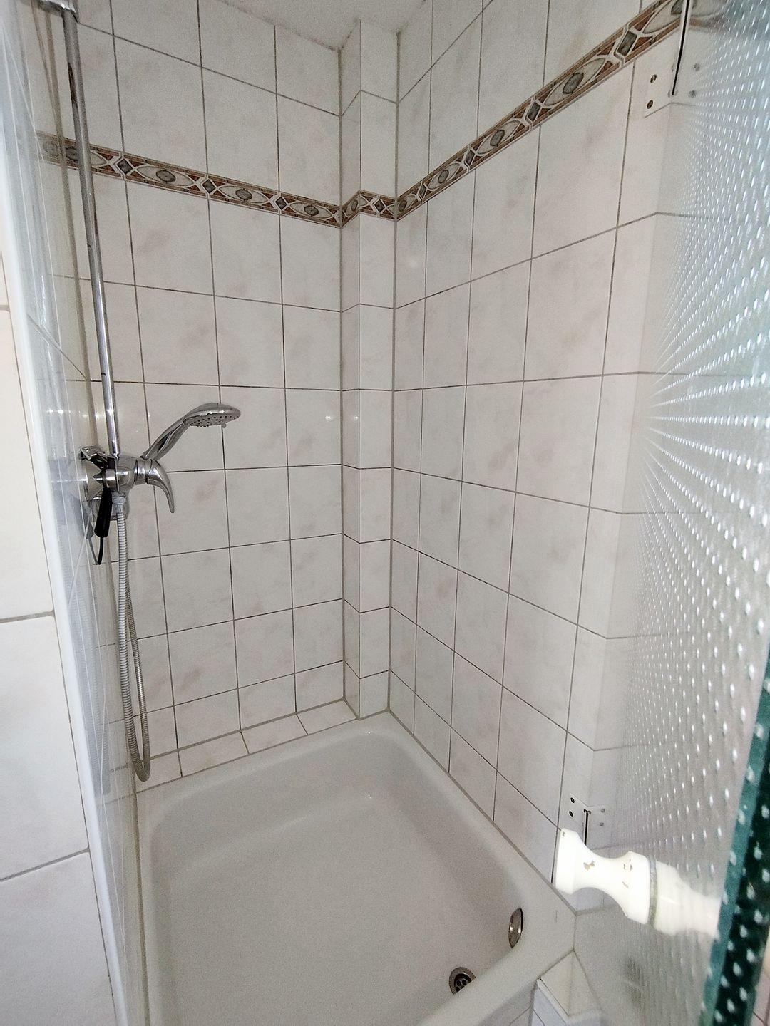 Das Duschbad wurde mit großem Spiegel- und Waschbeckenschrank, einer Nischendusche mit Glasduschwandwand und WC ausgestattet.