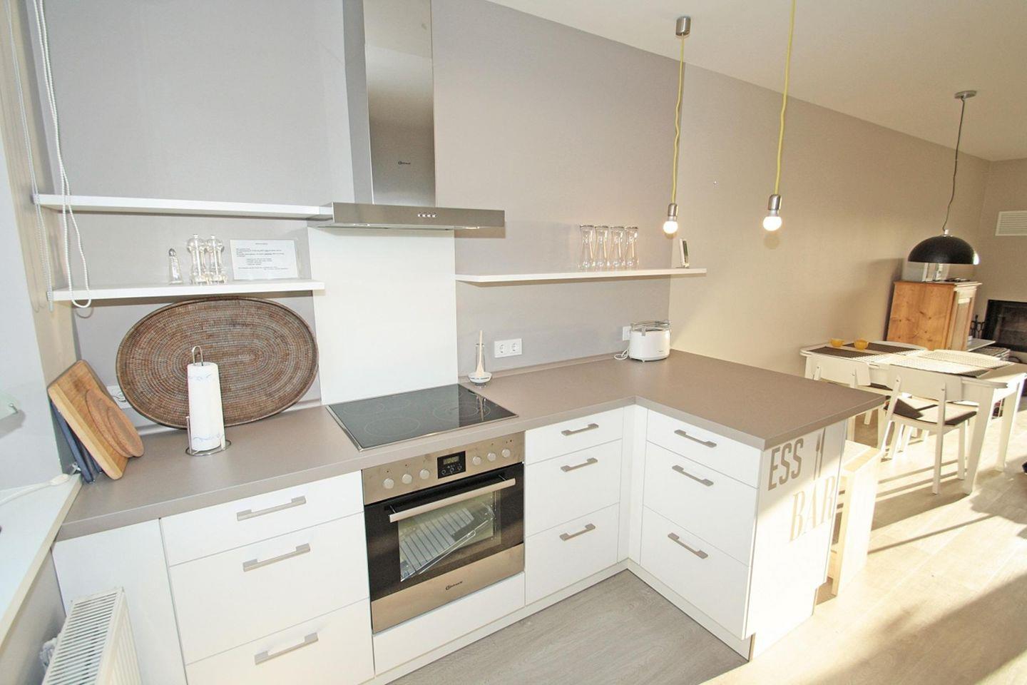 Der Wohnbereich im 1. OG mit offenem Kamin hat Zugang zur Terrasse. Eine neue hochwertige Couch und 2 Sessel sowie Couchtisch laden zum Relaxen ein. Der angeschlossene Essbereich mit Tisch und 4 Stühlen, großem LCD-TV, CD-u. DVD-Player ist offen zum Küchenbereich mit neuer wertiger Küche. Diese verfügt über 4-Plattenherd, Geschirrspüler, Mikrowelle, Backofen, Kühlschrank mit Gefrierfach sowie einer "Ess-Bar" mit 2 Stühlen. Ein Gäste WC ist direkt nebenan.
