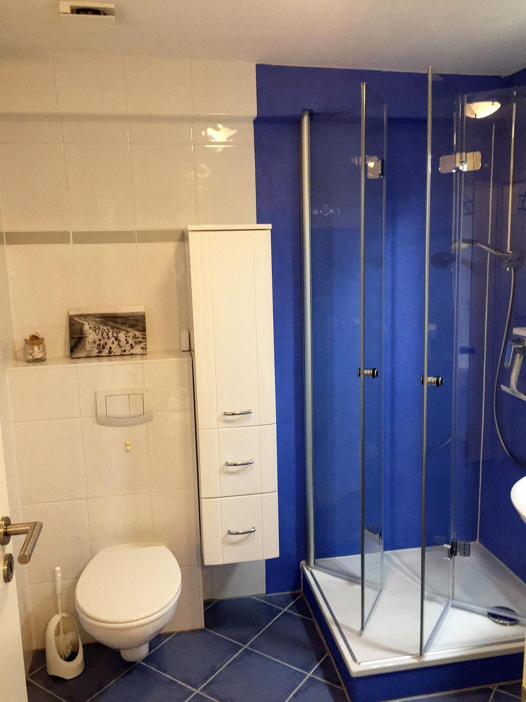 Das Bad ist mit Dusche mit Glasduschwand, Handtuchheizkörper und beleuchtetem Spiegelschrank komfortabel ausgestattet.
