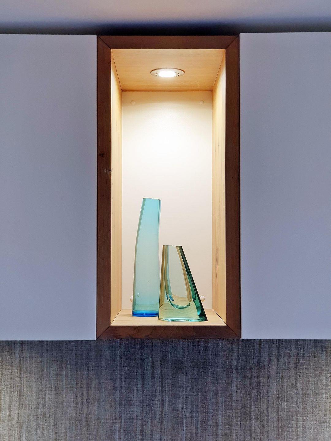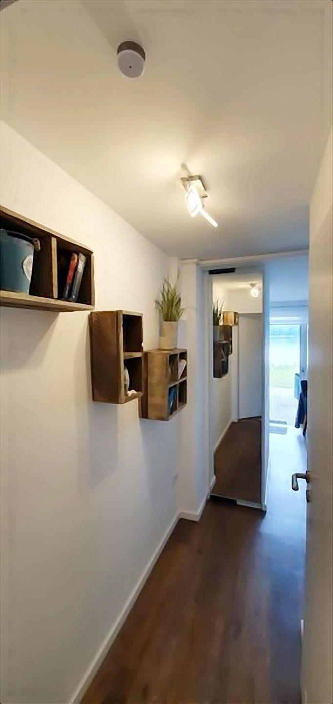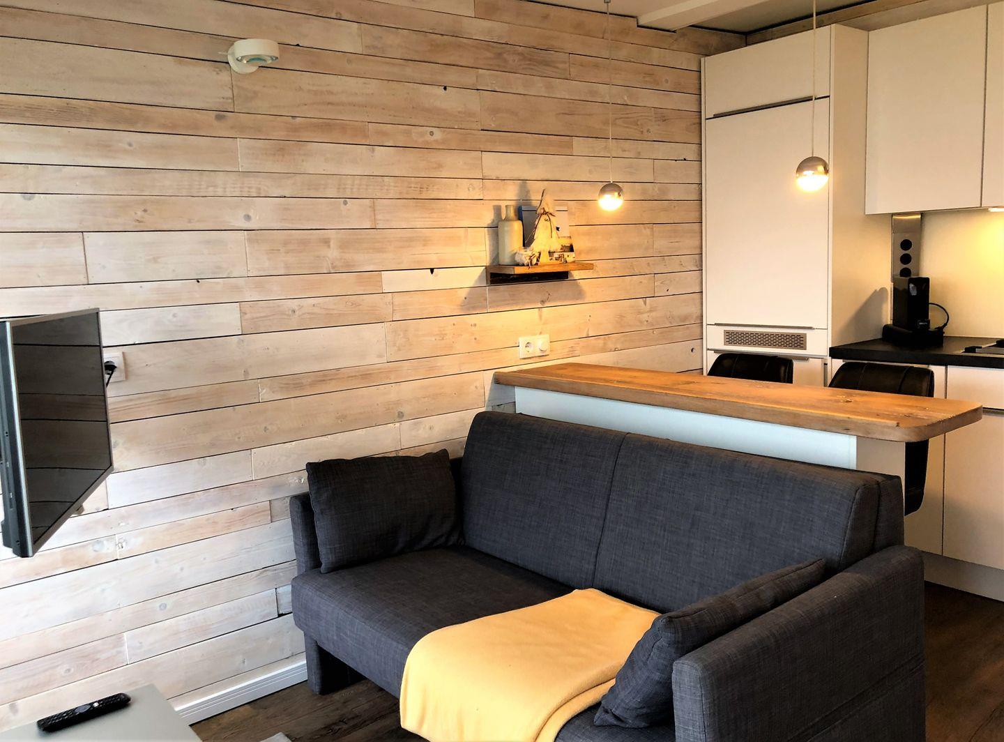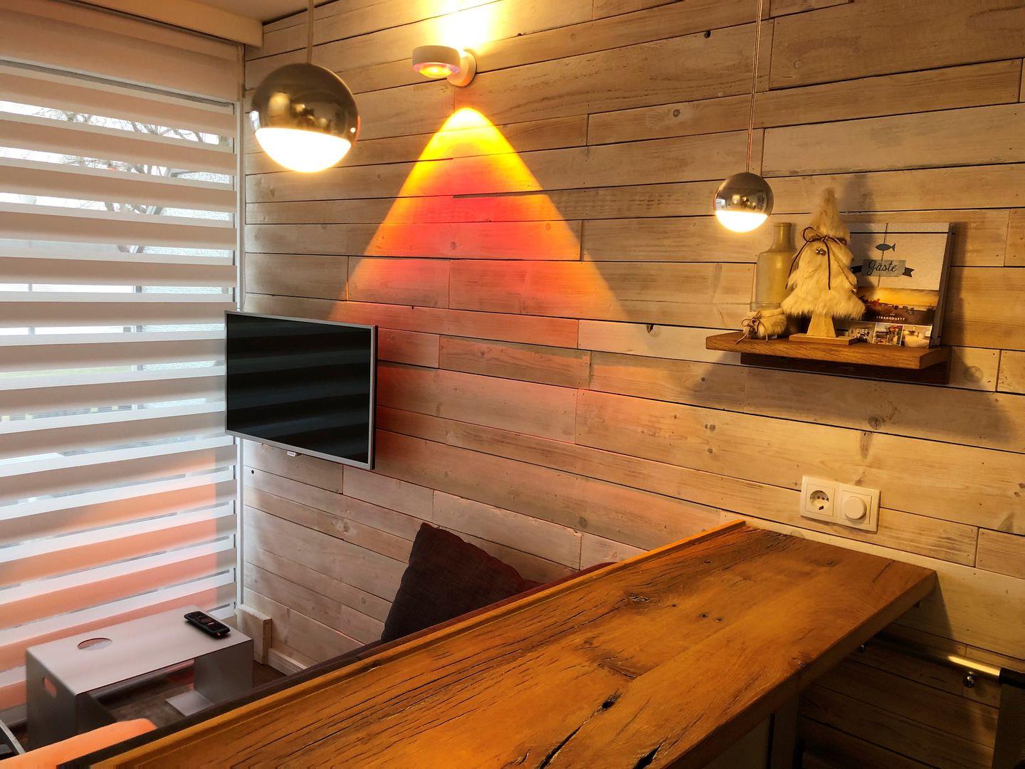 - Wohnzimmer mit stylischem, individuell aus altem Hafenholz gefertigtes Seeblick-Tresen, moderner Echtholzwand, Smart-TV, Garderobe, Sofa, moderner, dimmbarer Beleuchtung