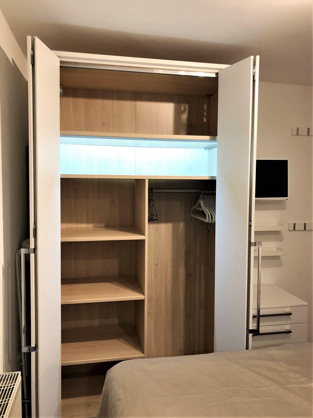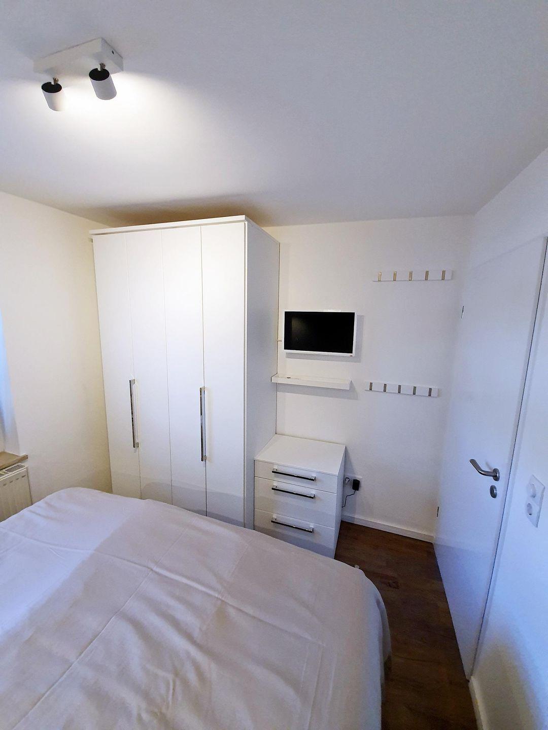 - Schlafzimmer mit 160 cm breitem, maßgefertigtem komfortablen Bett, TV, beleuchtetem Kleiderschank