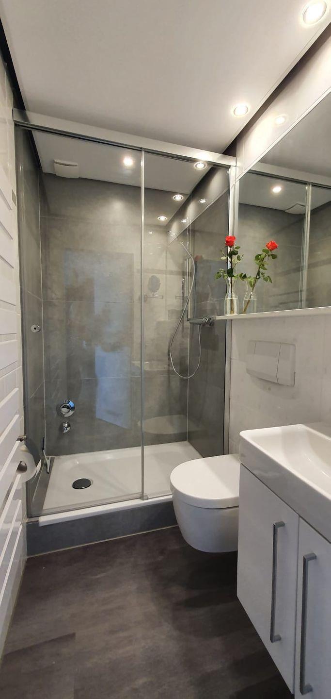 - Duschbad mit hochwertiger Keramik, großer Dusche mit Glasduschwand und Handtuch-Heizkörper