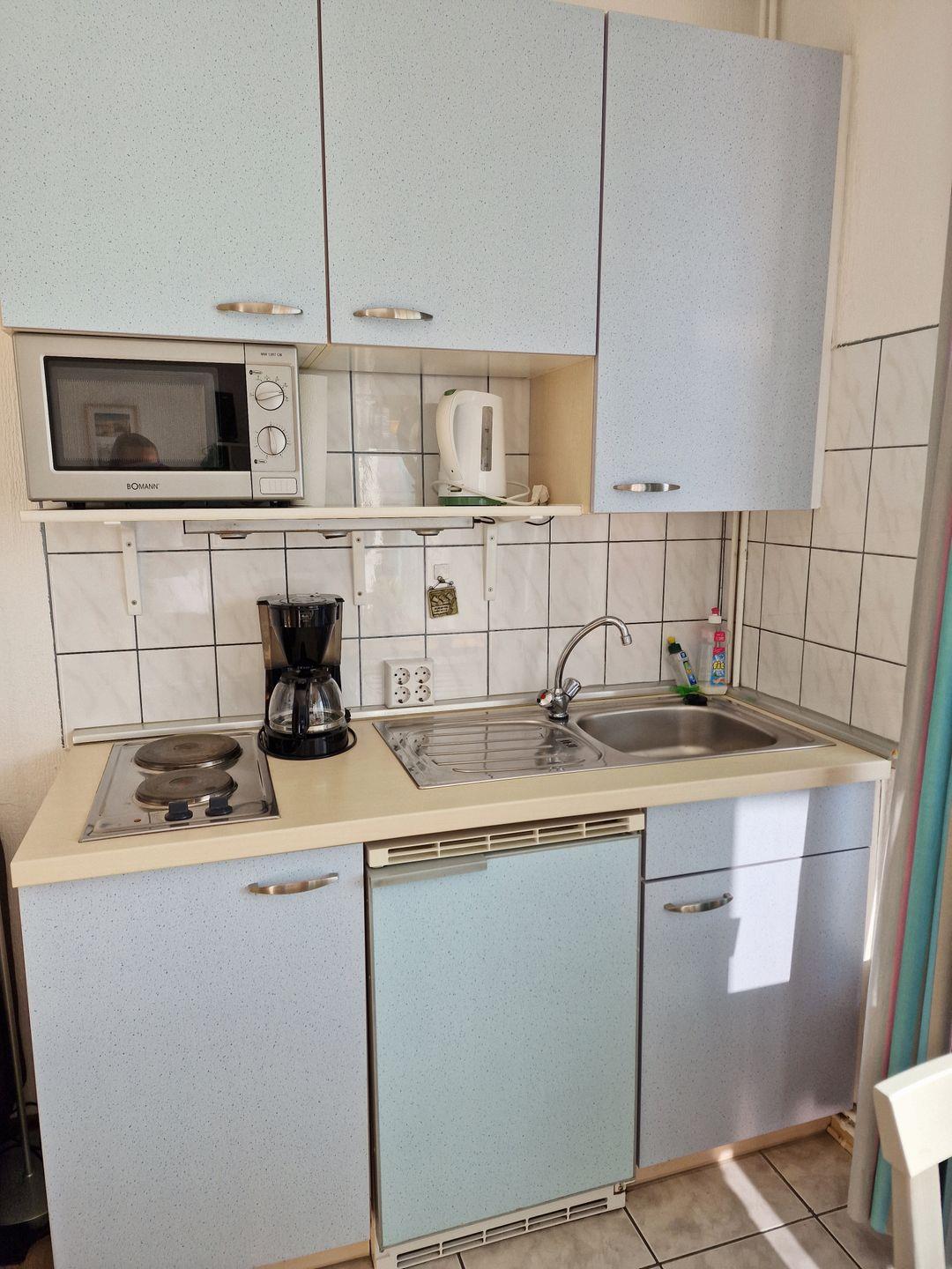 Die Küchenzeile verfügt über einen 2-Platten-Herd, eine Microwelle und Kühlschrank mit Gefrierfach.