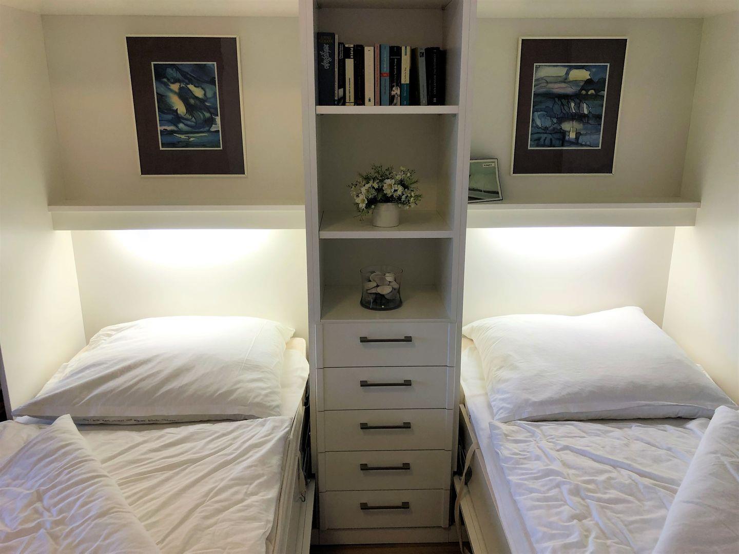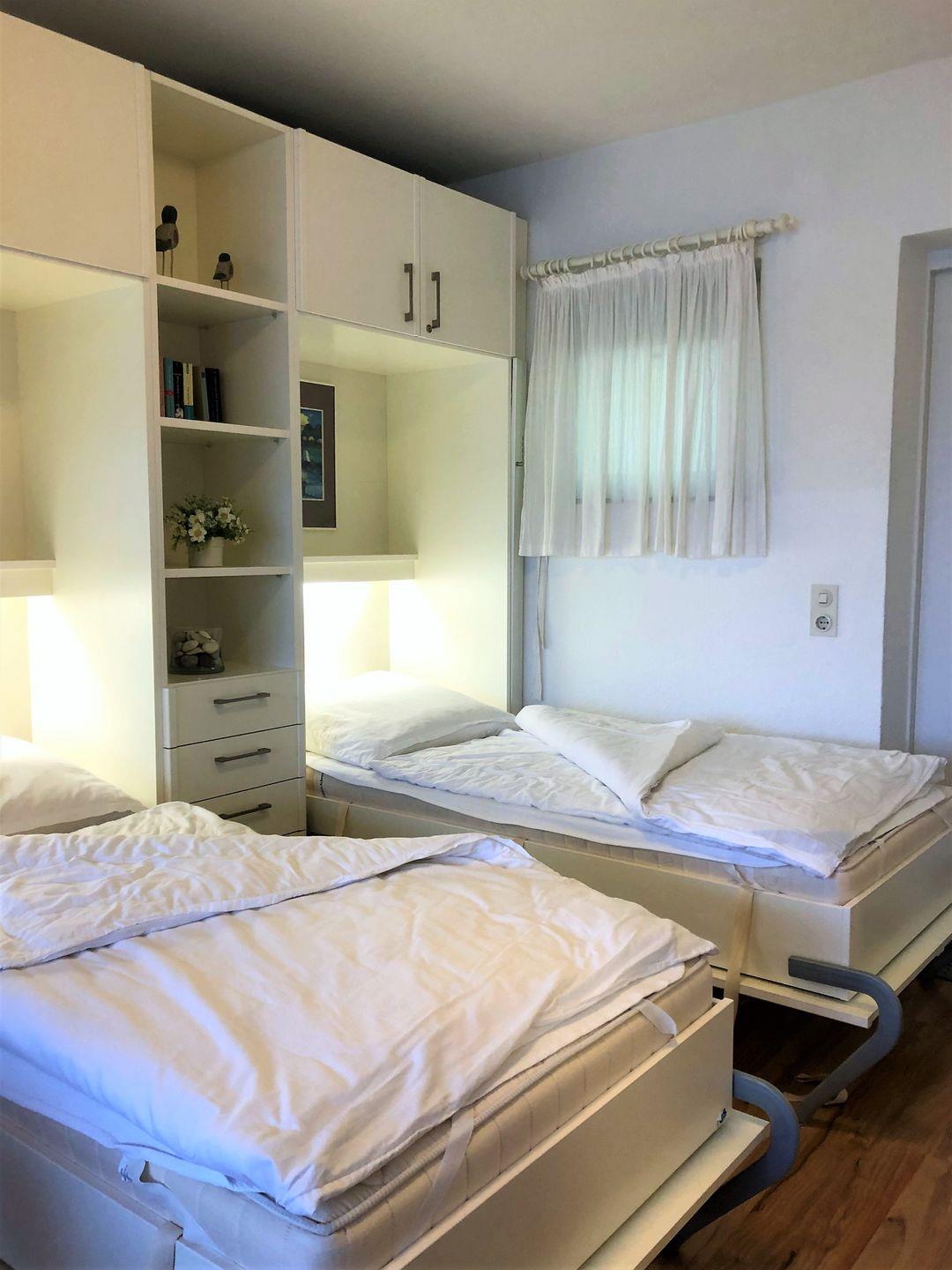 Das weiße Schrankbett bietet zwei separate, komfortable Betten (80*200 cm) mit Einbaulampen am Kopfende.