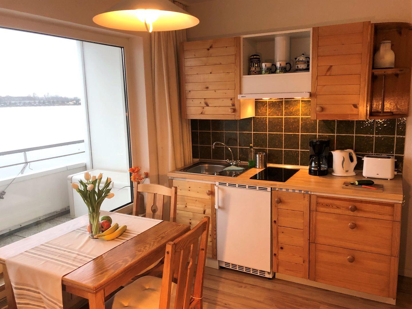 Vom Esstisch an der Fensterfront genießen Sie die herrliche Aussicht aus dem 2. Stock über den Binnensee. Mit dieser Aussicht schmeckt das Urlaubsmenü aus der angrenzenden Küchenzeile gleich doppelt so gut. Diese ist mit Kühlschrank mit Gefrierfach, 2-Feld-Ceranherd, Spüle, gängigen Geräten und Geschirr ausgestattet.