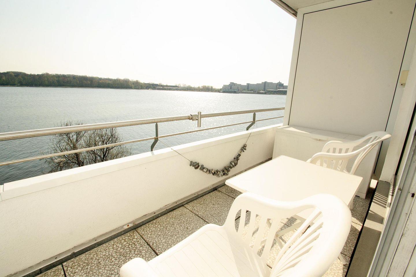 Auf dem möblierten Südbalkon genießen Sie von vormittags bis abends die Sonne beim Blick über den See, auf die hauseigene Liegewiese mit direktem Zugang zum Wasser, Steg und Grill.