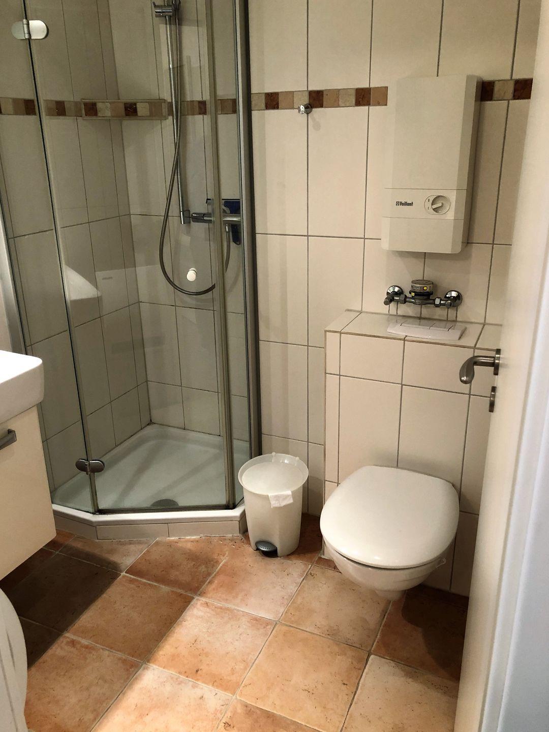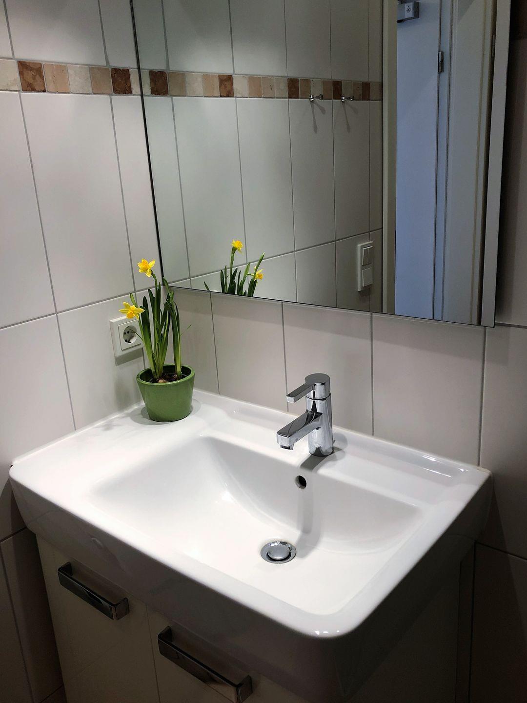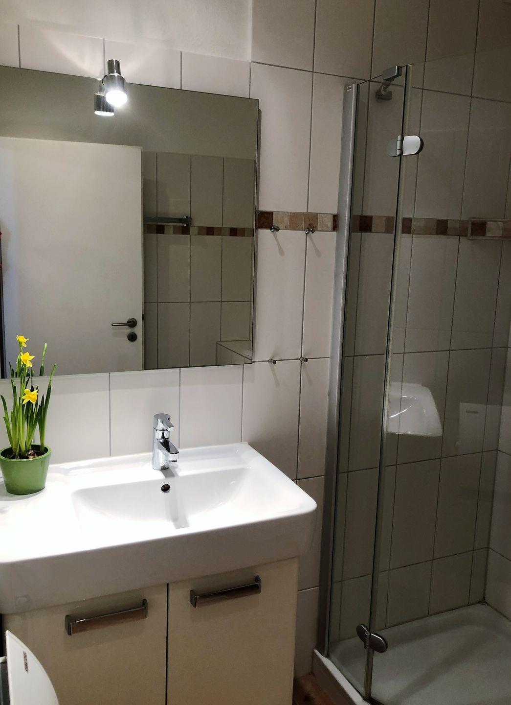 Das helle, innenliegende Bad ist mit modernem Hänge-WC, Waschbecken mit beleuchtetem Spiegel, elektrischem Heizlüfter und Eck-Dusche mit Glaskabine ausgestattet.