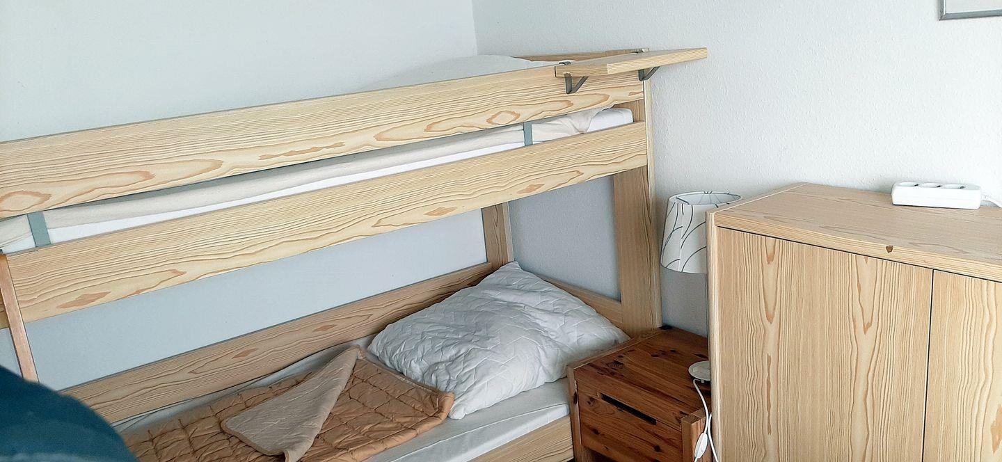Ein innenliegendes Schlafzimmer mit Doppelbett (160*200 cm), Nachtschrank und Kommode für Ihre Urlaubsgarderobe sowie ein weiteres separates Schalzimmer mit Etagenbett 2*90*200 cm), Kommode und Fenster stehen für entspannte Nächte bereit. Ein Verdunklungsrollo sorgt auch am Tag für ein ungestörtes Nickerchen. Ein großer Kleiderschrank im Flur bietet jede Menge Stauraum.
