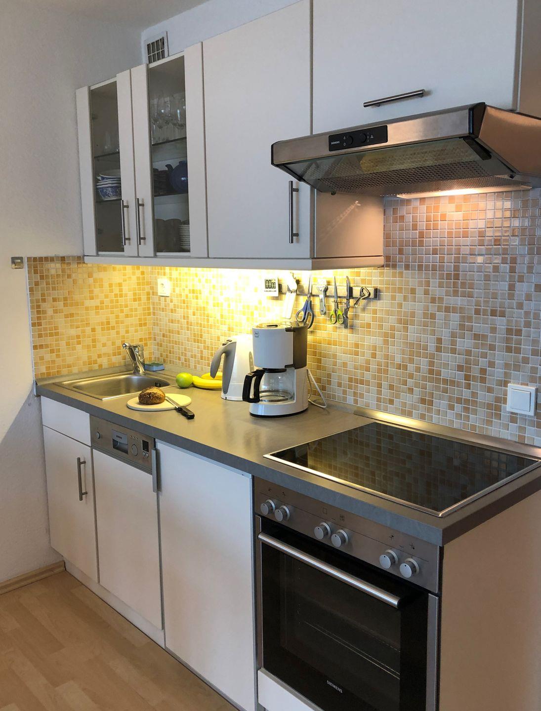 Im kombinierten Wohnzimmer mit Zugang zum Balkon finden Sie am großen Esstisch Platz für gemeinsame Mahlzeiten die Sie in der angrenzenden Küchenzeile zubereiten können. Diese ist mit 4-Feld-Ceranherd, Backofen, Spülmaschine, Kühlschrank mit Gefrierfach sowie Ausstattung zum Kochen und Genießen optimal zur Selbstversorgung ausgestattet.