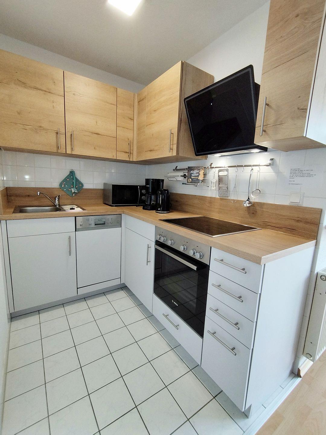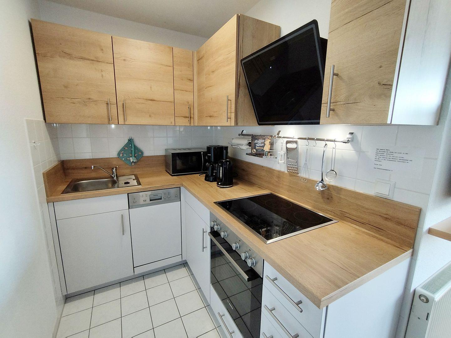 Die moderne Küche ist in L-Form gestaltet und verfügt über 4-Platten-Ceranfeld, Backofen, Geschirrspüler und Mikrowelle.
