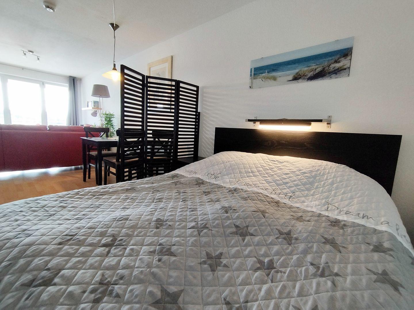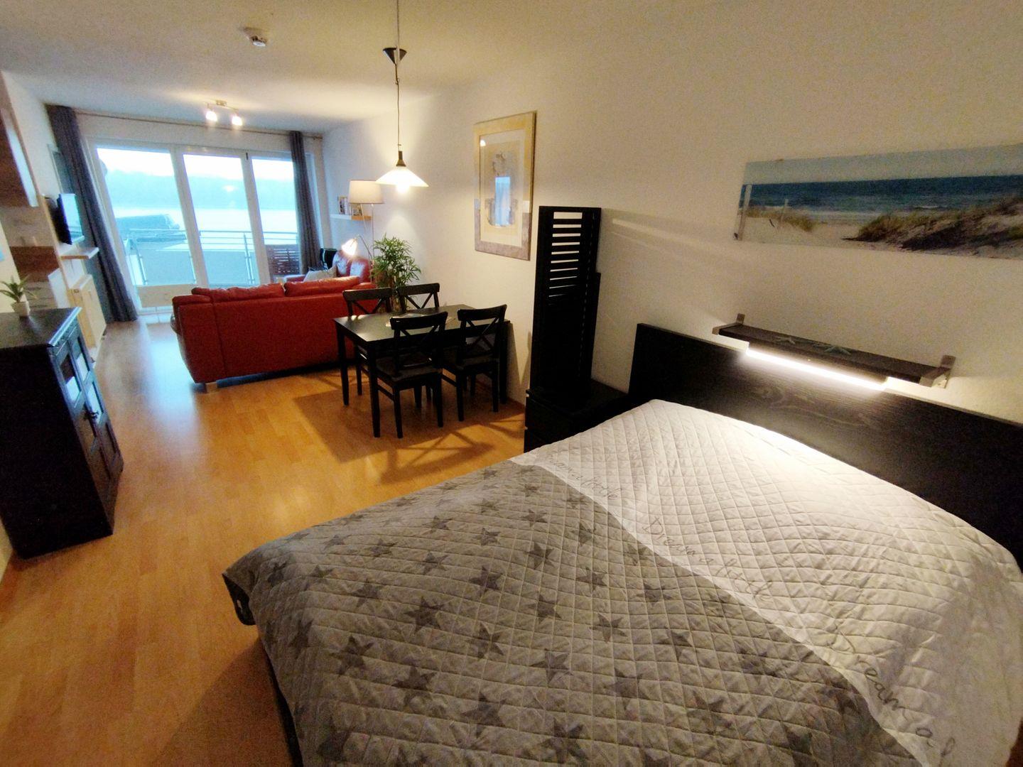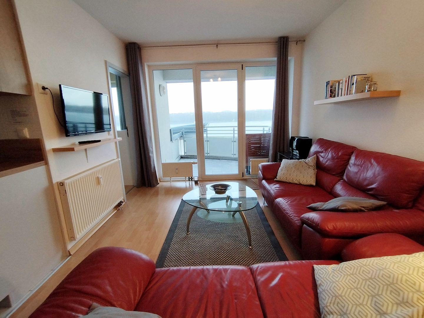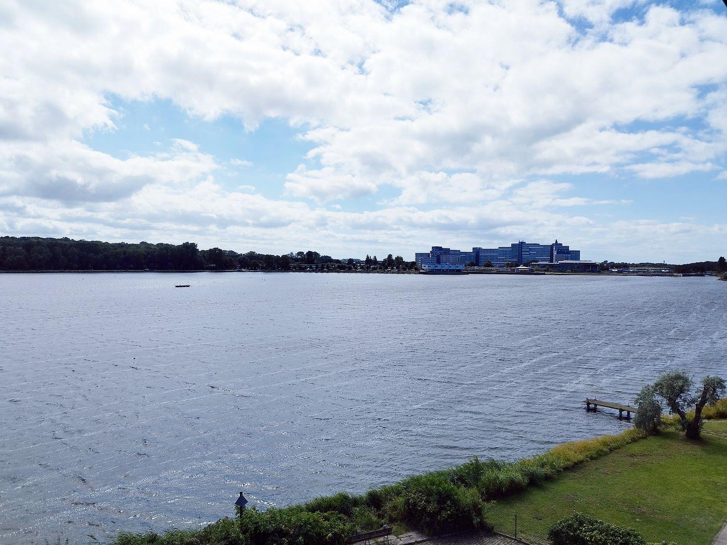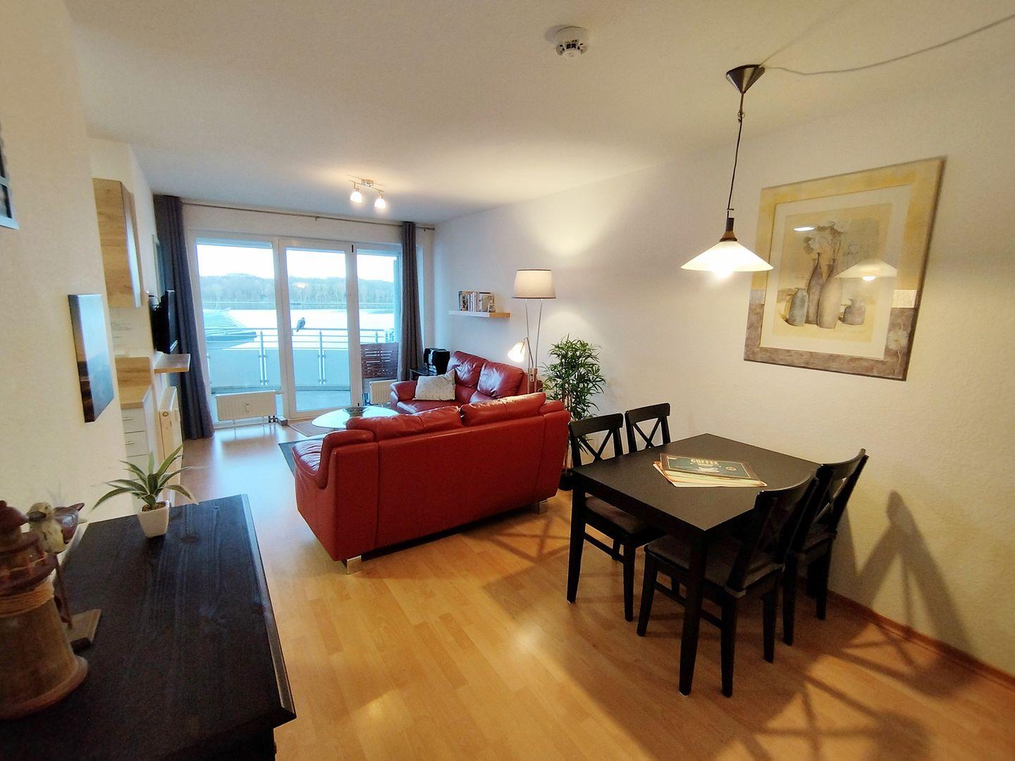 Helle Wohnung mit Balkon und Blick auf den Binnensee in Heiligenhafen, ideal für einen erholsamen Urlaub.