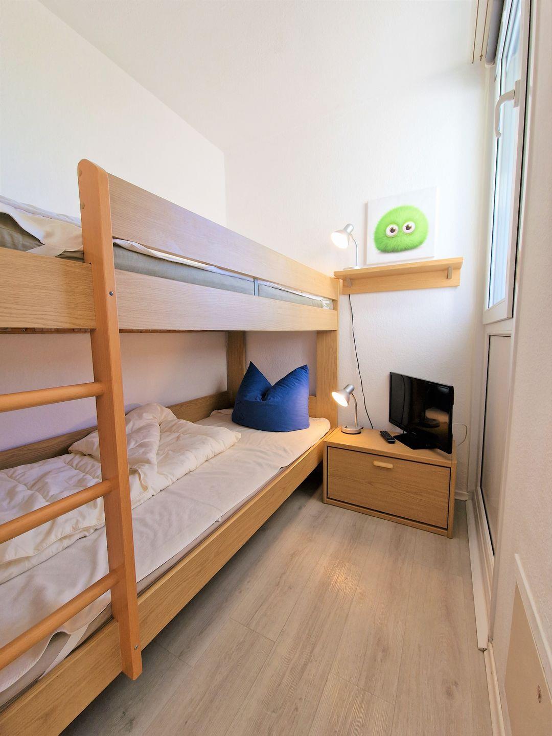 Der moderne Wohnraum ist mit einer 3er Couch aus Leder und 2 Sesseln ausgestattet, schöne Bilder und Vorhänge machen den Raum gemütlich, außerdem befindet sich auf dem neuen Sideboard ein großer LCD-Flachbildschirm (ca.120cm), DVD-Player und ein Radio mit CD. Die integrierte Essecke befindet sich am Fenster. Das Schlafzimmer ist mit 2 Türen vom Wohnbereich abgetrennt. Hier befindet sich ein 1,8x2m großes Doppelbett (mit 2 Matratzen je 0,9x2m), 2 Nachttische mit Leselampen sowie ein Flachbild-TV. Die buchefarbene Küche ist mit 4*Platten- Induktionsherd, kl. Backofen, Mikrowelle, Kaffeemaschine und Kühlschrank mit Gefrierfach ausgestattet. Im separaten Kinderzimmer befindet sich ein großes Vollholz- Hochbett (90x200cm) und eine kleine Kommode, auf dem ebenfalls ein kleiner Flachbild-TV zu finden ist.