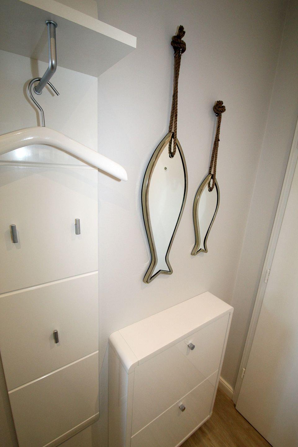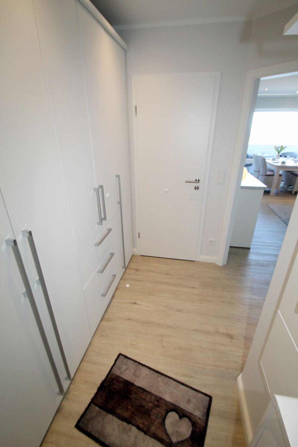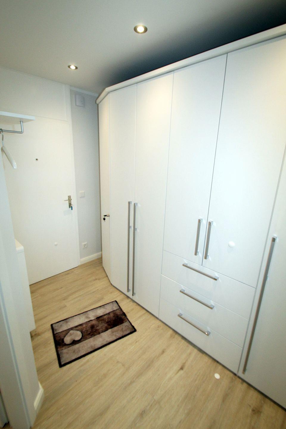 Der Flur, welcher ebenfalls vergrößert wurde, erleichtert das Eintreten in die Wohnung. Auch hier ist die Ausstattung komfortabel: ein großer Kleiderschrank, Schuhschrank, Garderobe und Spiegel.