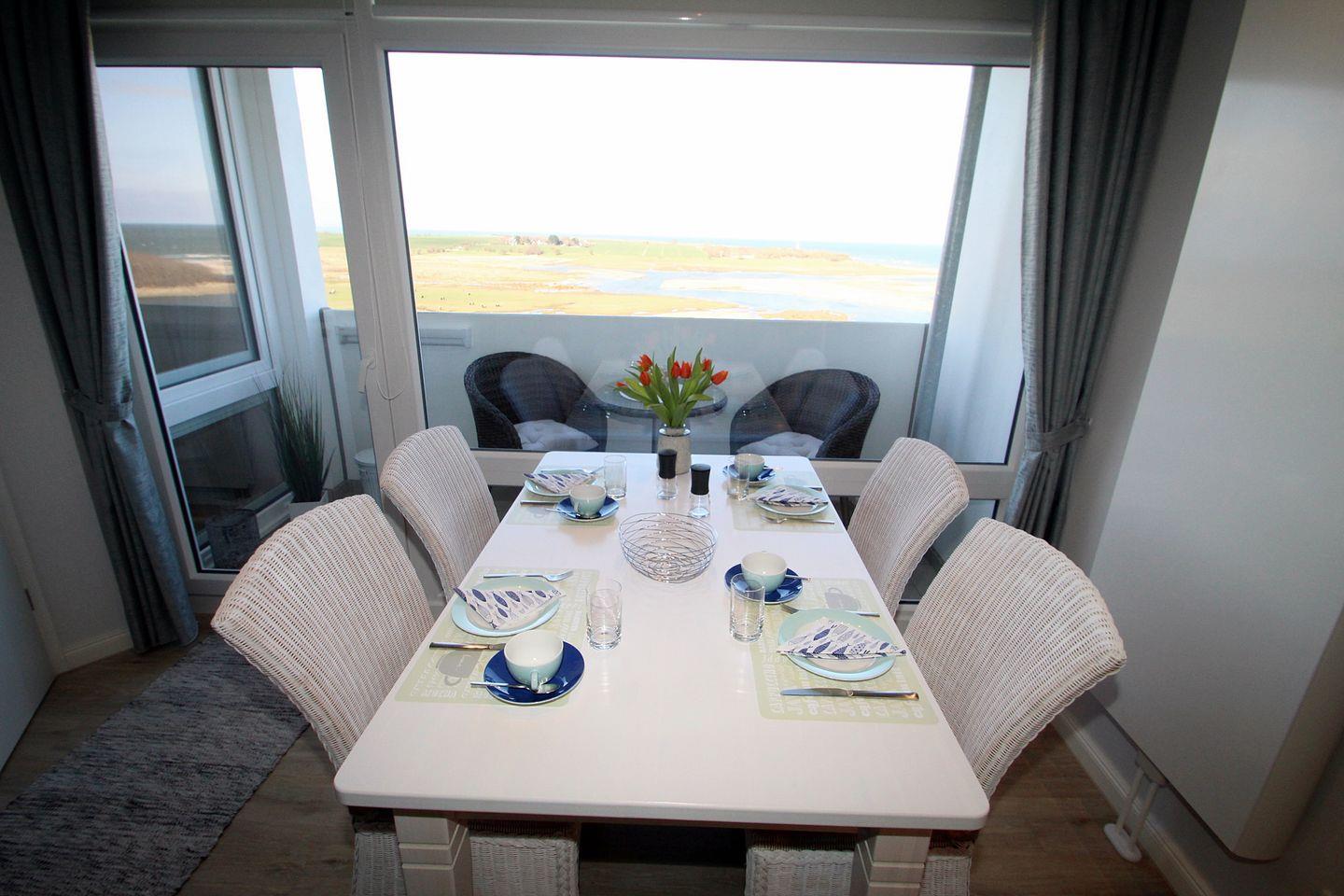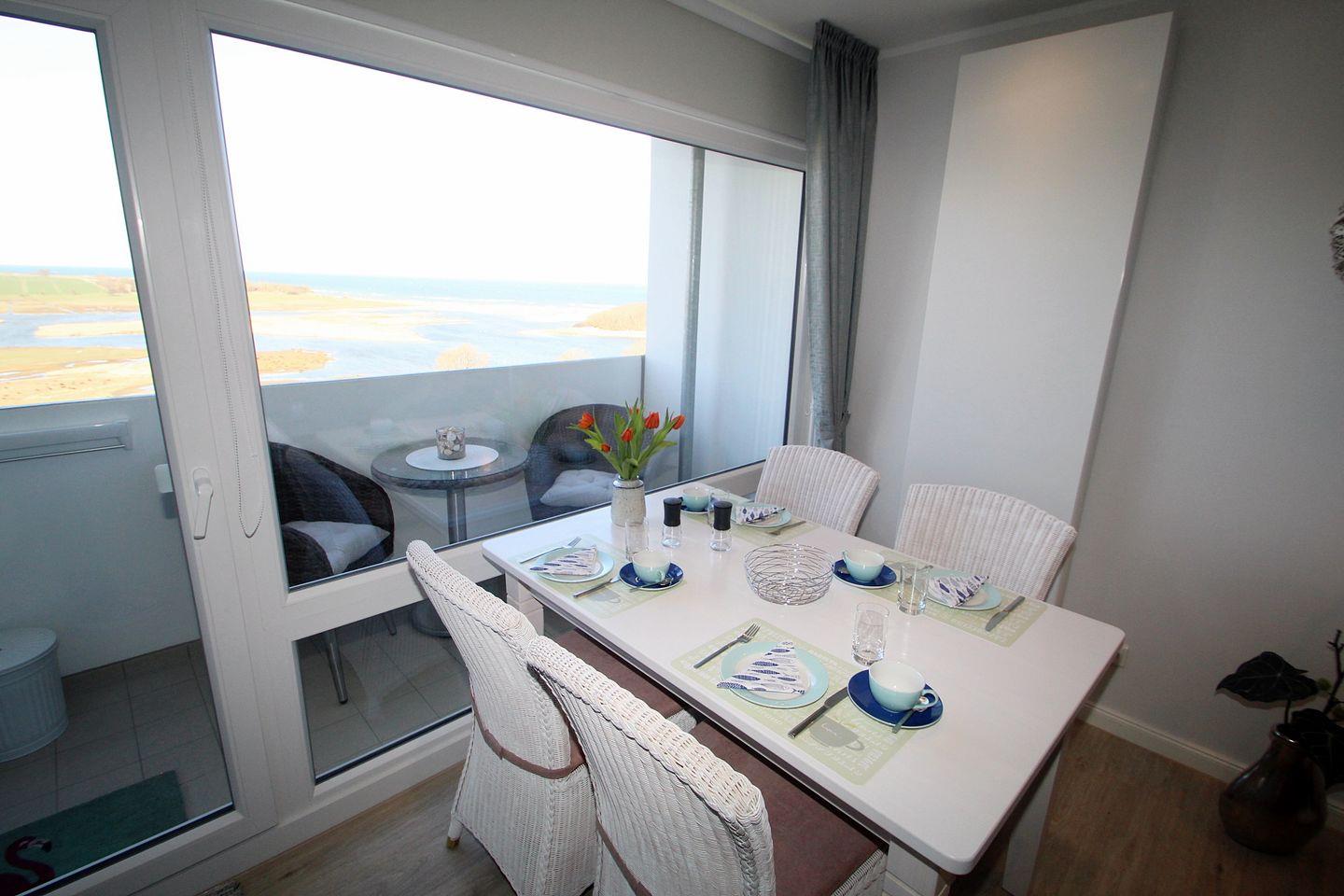 Die gemütliche Essecke am bodentiefen Fenster lädt zum Verweilen ein. Von hier können Sie den traumhaften Blick zur See über die Salzwiesen bis zum Leuchtturm genießen.