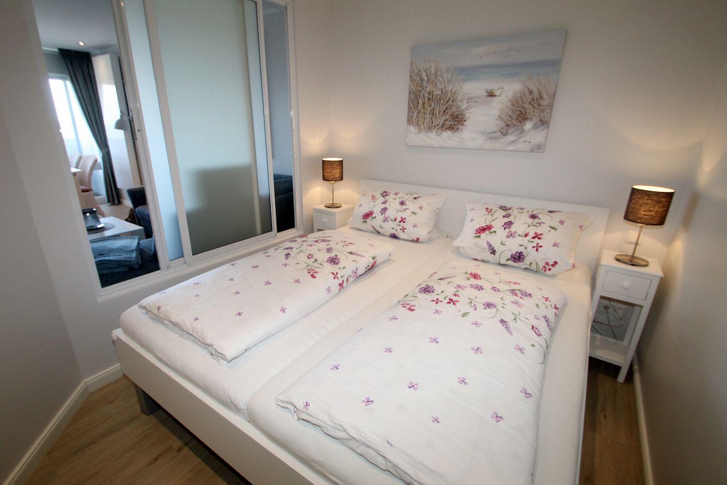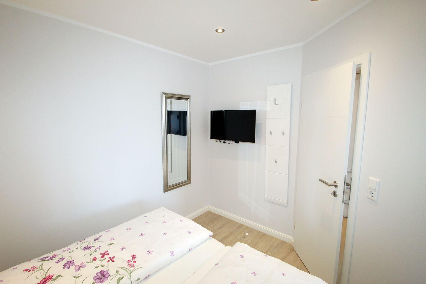 Im separaten Schlafzimmer sorgt ein neues Doppelbett mit Komfort-Matratzen (180 x 200cm) für einen entspannten Schlaf. Für ausreichende Belüftung sorgt das große Schiebefenster, welches auch ein Verdunklungsrollo hat. Auch hier ist ein Flachbild-TV vorhanden, sowie ein Ganzkörperspiegel und Garderobe. Vom Bett aus kann die Deckenbeleuchtung ausgeschaltet werden.
