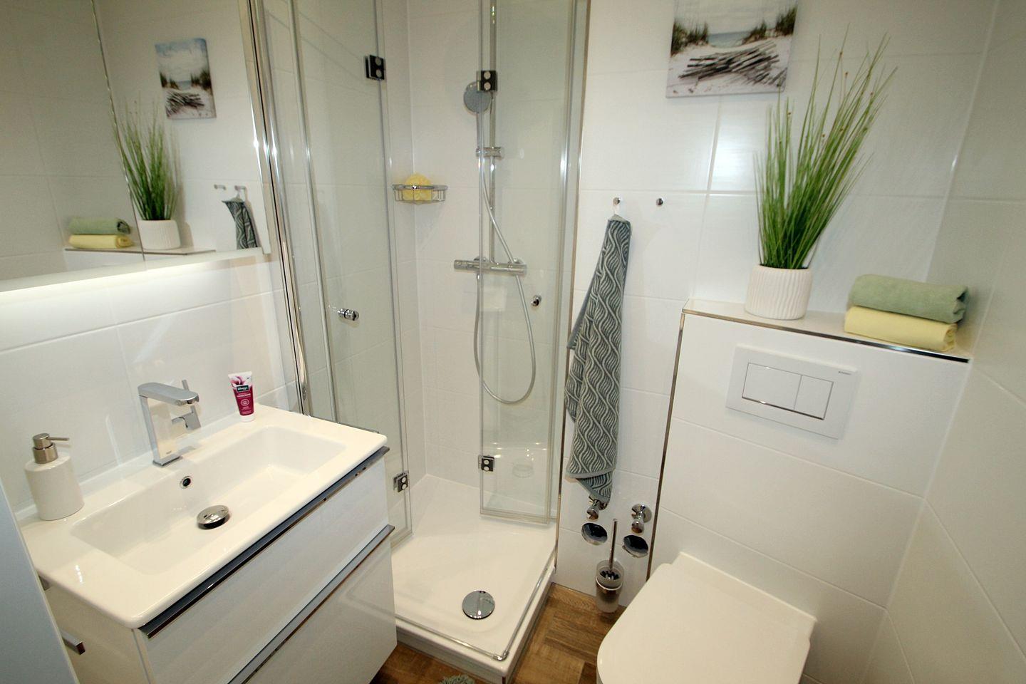 Im Bad, welches etwas vergrößert wurde, überzeugen eine Glas-Duschkabine mit Regendusche, modernem Hänge-WC, Handtuchheizkörper, ein hochwertiger Waschtischunterschrank mit Handtuchhalter und ein Spiegelschrank (mit zusätzlicher, ständig leuchtender Nachtbeleuchtung). Der dunkle Fußboden in Holzoptik rundet die Ausstattung ab.