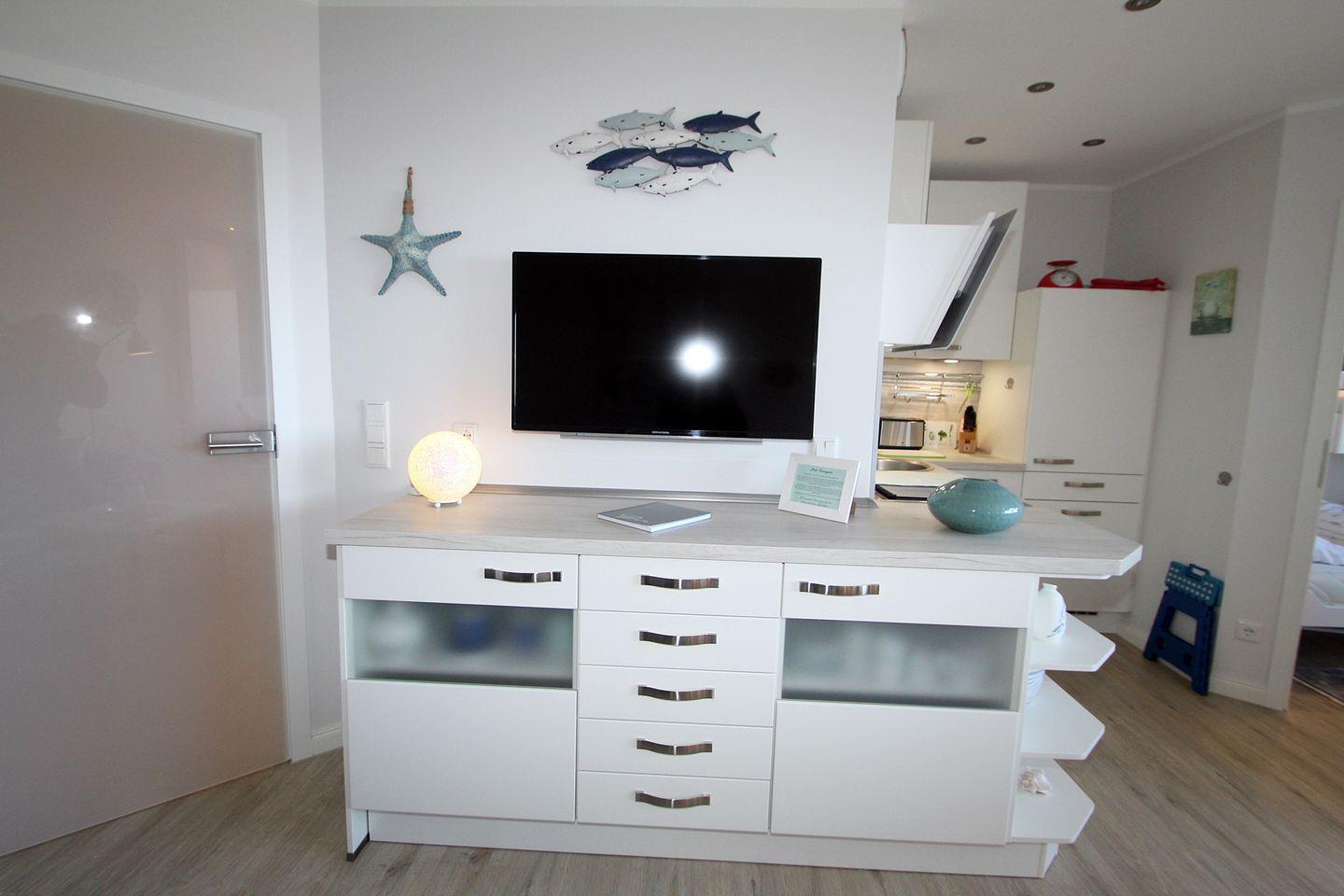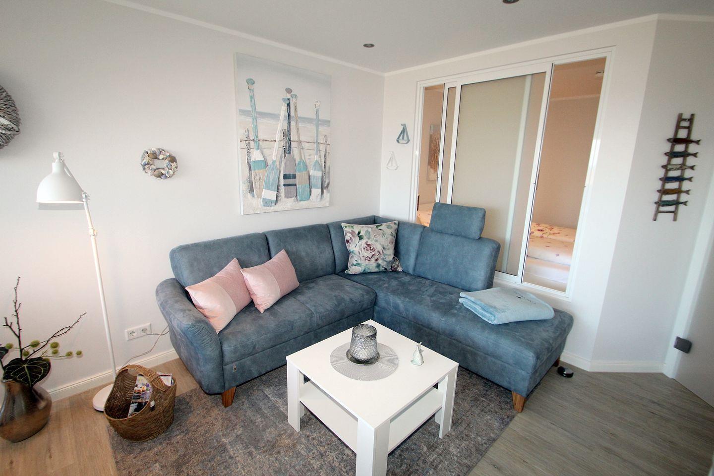 Im großzügigen Wohnraum steht ein bequemes Ecksofa mit Kopfstütze zum Entspannen. Ein großer Flachbild-TV, HiFi-Anlage, Radio und CD-Player sorgen für mediale Unterhaltung.