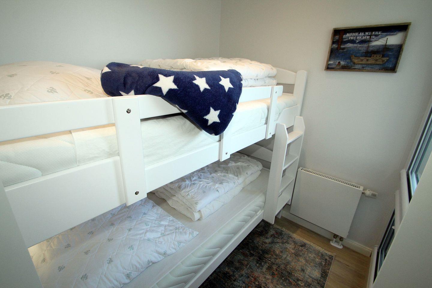 Im angrenzenden Kinderzimmer befindet sich ein Etagenbett mit hochwertigen Matratzen (90 x 190cm), welche für einen erholsamen Schlaf sorgen. Das bodentiefe Fenster hat ein Verdunklungsrollo mit Drehkippfunktion. Auf dem Nachttisch steht ein Radio mit CD-Player.