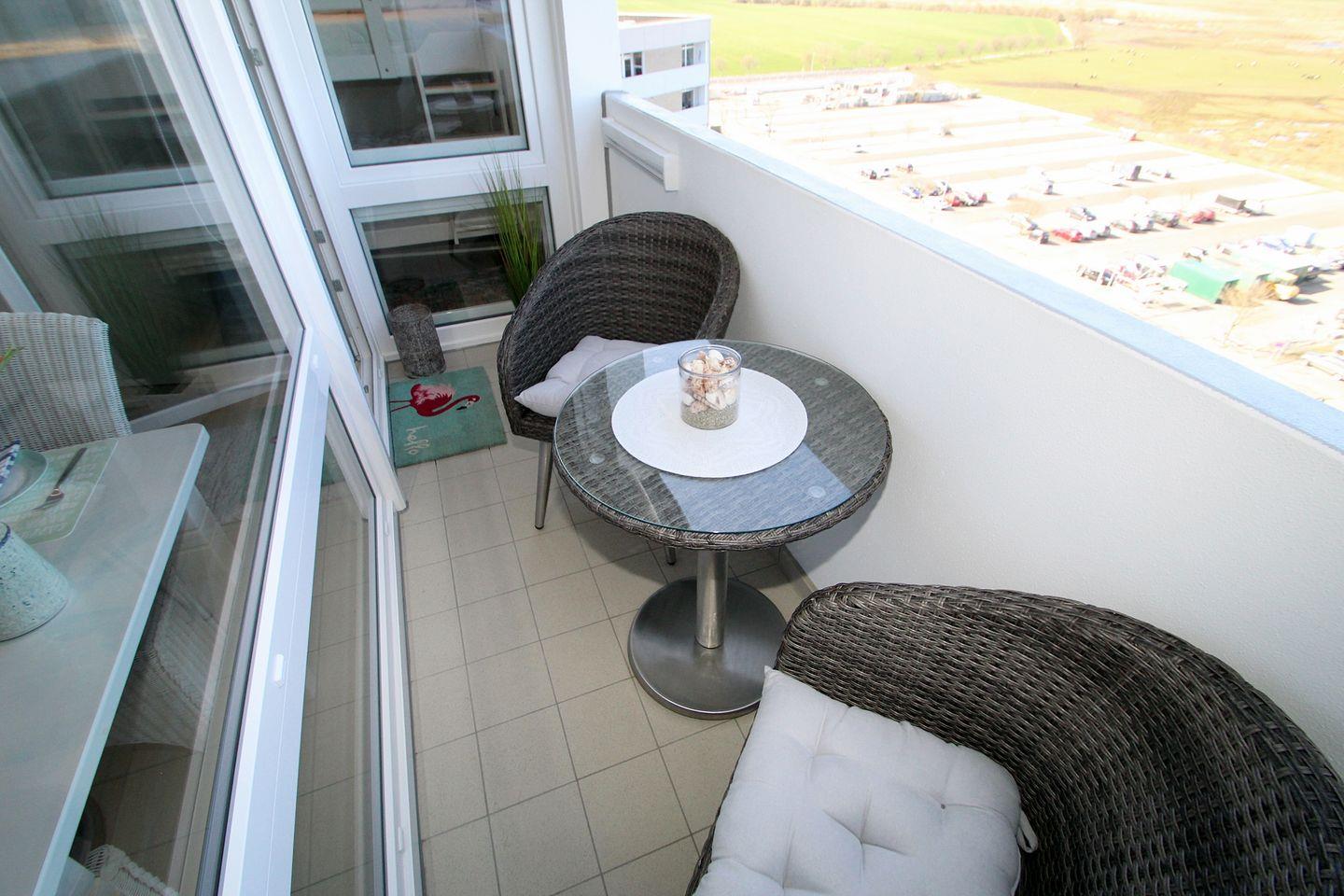 Eine einladende Sitzgruppe mit Blick zur Ostsee ist auf dem Balkon vorhanden. Eine Sonnenmarkise mit Fernsteuerung verschönert Ihren Urlaub.