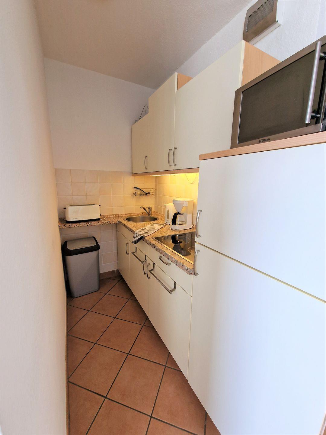 Die praktische Küche verfügt über ein 4er-Ceranfeld, eine Mikrowelle mit Grill- und Umluftfunktion, sowie einem Kühlschrank mit großem Gefrierfach.