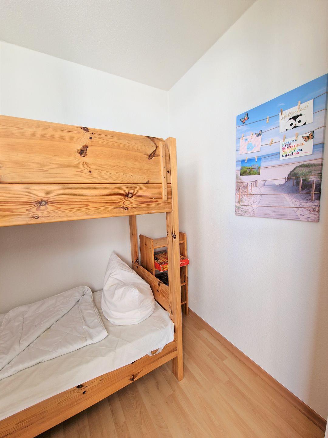 Im Kinderzimmer, ebenfalls vom Wohnraum mit einer Tür getrennt, steht ein Etagenbett mit neuen Matratzen.