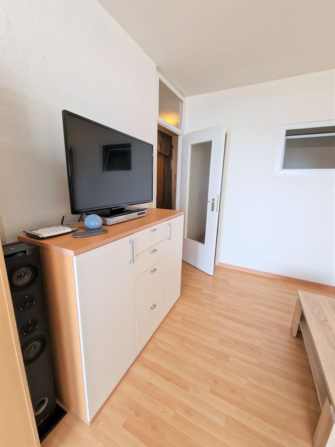 Der elegante Wohnbereich ist mit einem gemütlichen Schlafsofa ausgestattet. Die technische Ausstattung der Wohnung ist auf dem neuesten Stand: