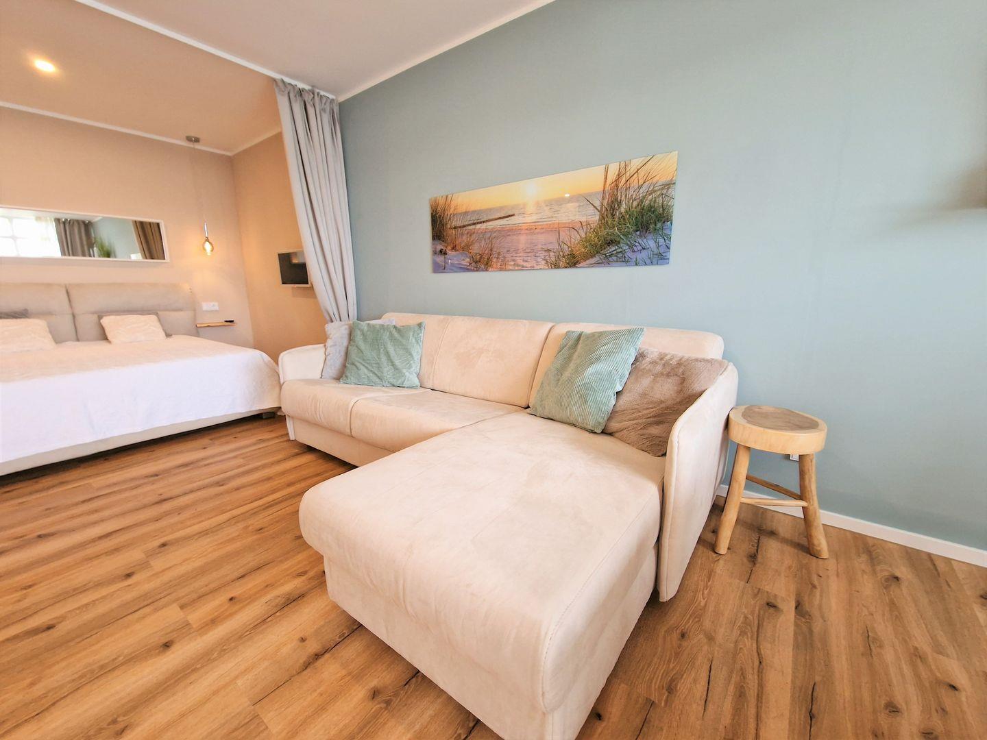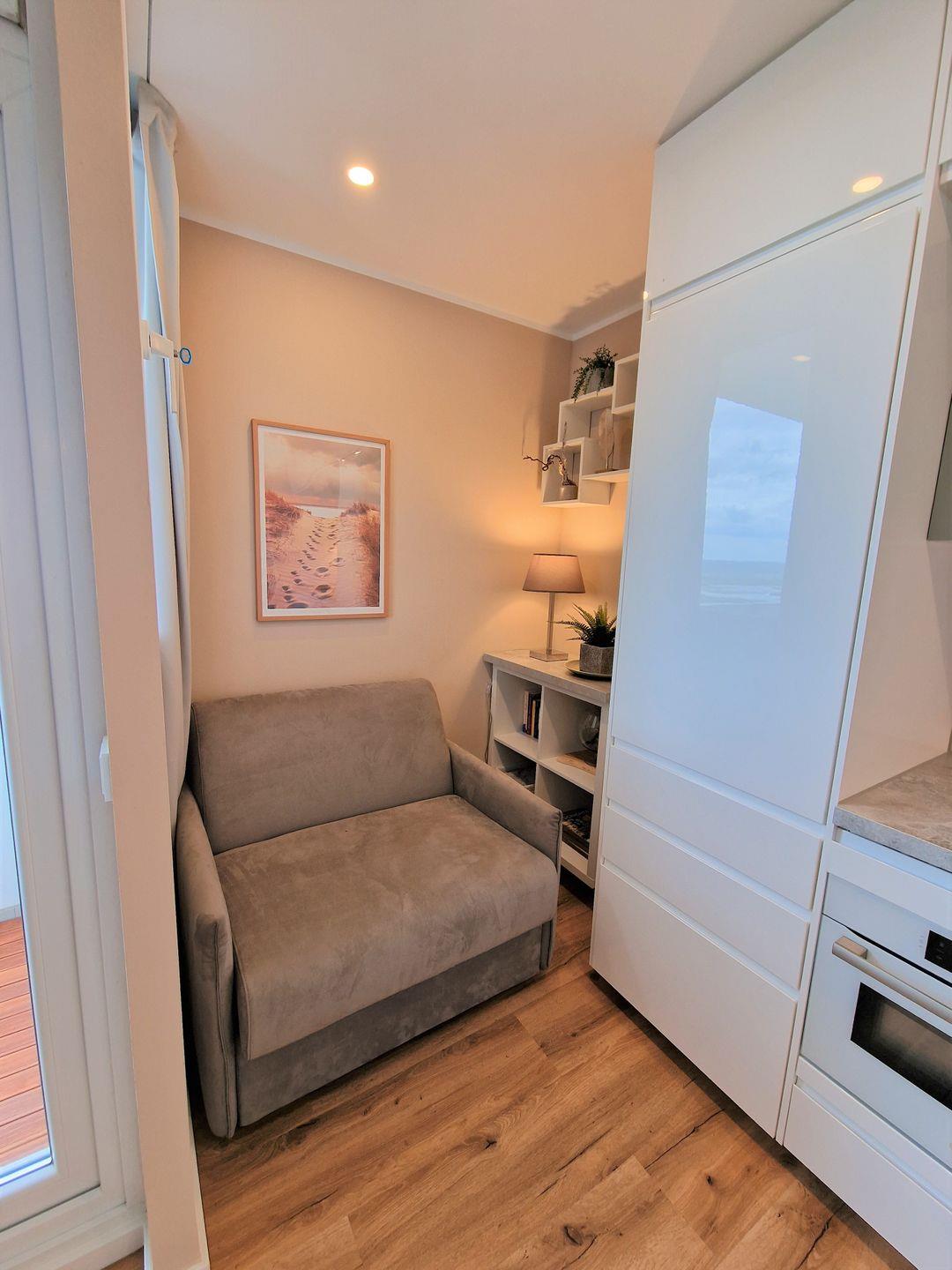 Das helle Wohnzimmer lädt mit einem gemütlichen Schlafsofa für zwei Personen dazu ein, sich zu entspannen und den Alltag hinter sich zu lassen. WLAN und ein großer Flachbild-TV sorgen für moderne Unterhaltung. Der gemütliche Schlafbereich mit Doppelbett ist durch einen Vorhang abtrennbar und bietet Ruhe und Privatsphäre. Zusätzlich steht ein Schlafsessel bereit, sodass die Wohnung flexibel für bis zu 5 Personen genutzt werden kann oder sie nutzen die behagliche Leseecke um in ein Buch zu versinken, während durch das Fenster sanftes Tageslicht fällt und den Blick auf den Balkon und ins Freie freigibt. Im hellen Badezimmer mit Glasduschkabine und einem WC mit BD-Funktion erwarten die Gäste ebenfalls kleine Annehmlichkeiten, wie z. B. ein beheizbarer Spiegel oder ein moderner Handtuchheizkörper.