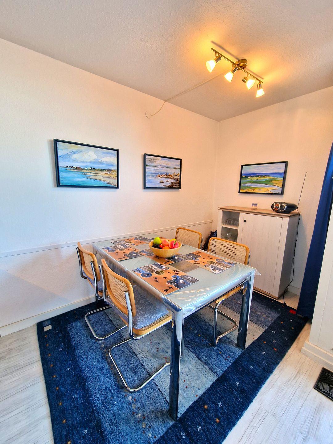 Der Wohnbereich ist komplett mit schönem und hellem Vinylboden ausgelegt und mit einer blauen Eckcouch mit Glastisch, Holz-Vitrinenschrank und einem 80cm Flachbild-TV ausgestattet. Regionale Spiele und Bücher sind vorhanden.