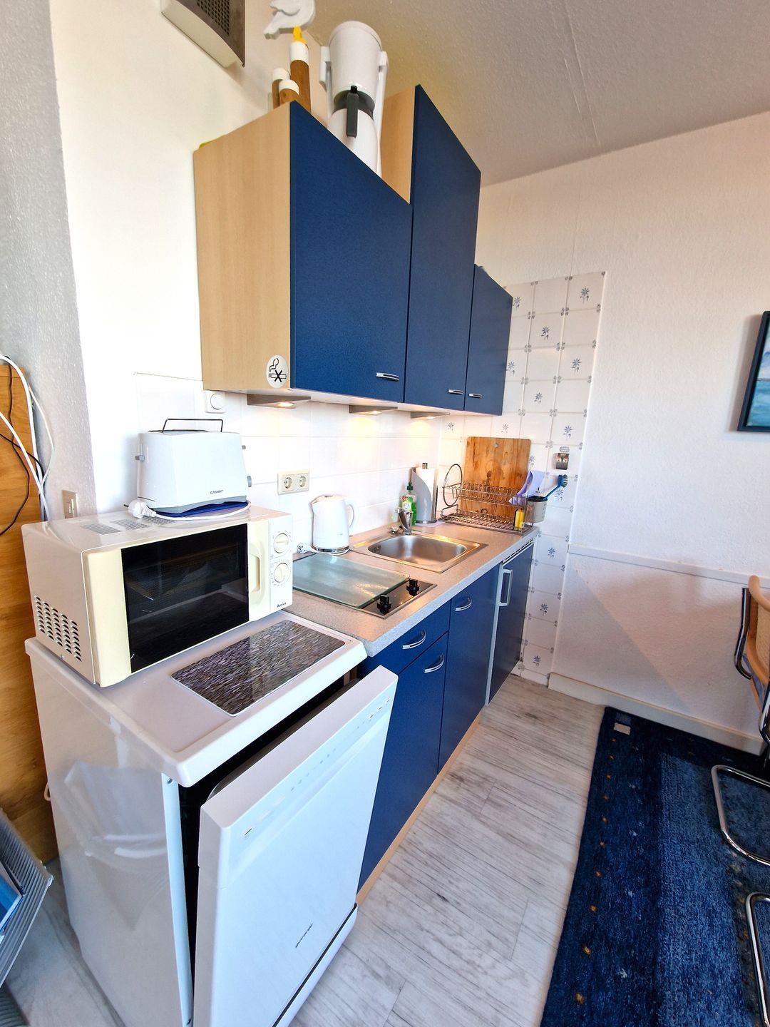 Die Küchenzeile verfügt über ein 2er Ceranfeld, eine Mikrowelle mit Grillfunktion, kleinen kleinen Backofen, einen Kühlschrank mit 2**-Gefrierfach, Kaffeemaschine, Wasserkocher, Eierkocher sowie eine Geschirrspülmaschine.