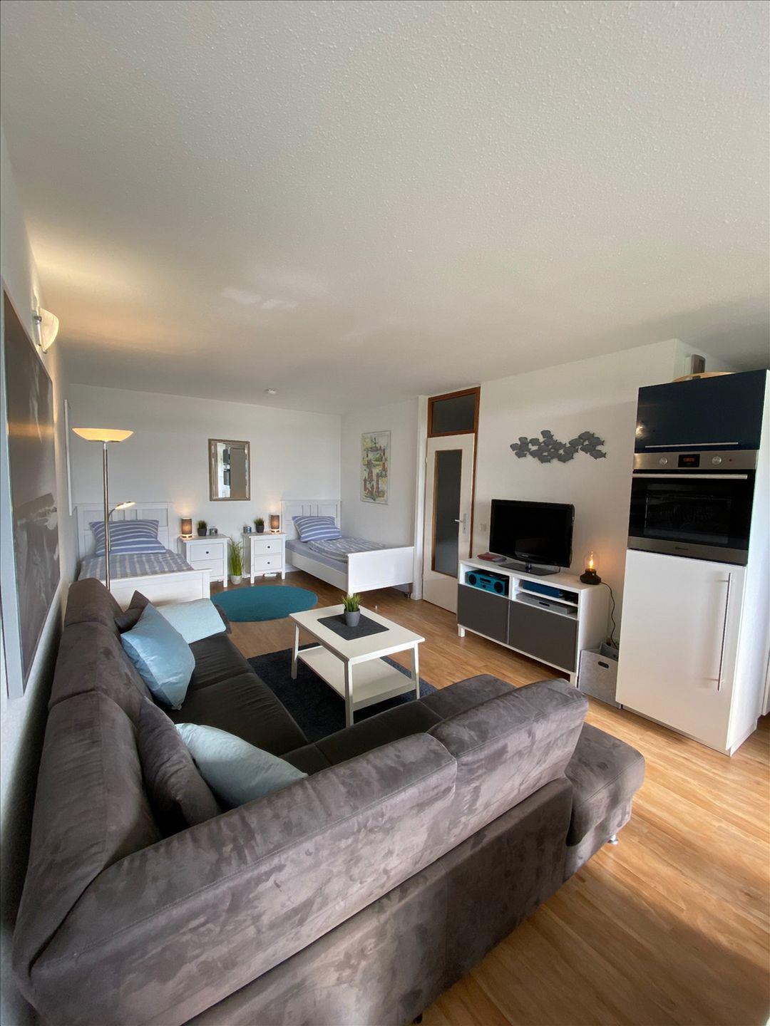 Wohnbereich mit einer gemütlichen Eck-Couch mit Ottomane, Flachbild-TV, HiFi-Anlage und DVD-Player. Gemütlicher Essbereich am Fenster. Alles Fenster sind mit Verdunklungsplissees ausgestattet.