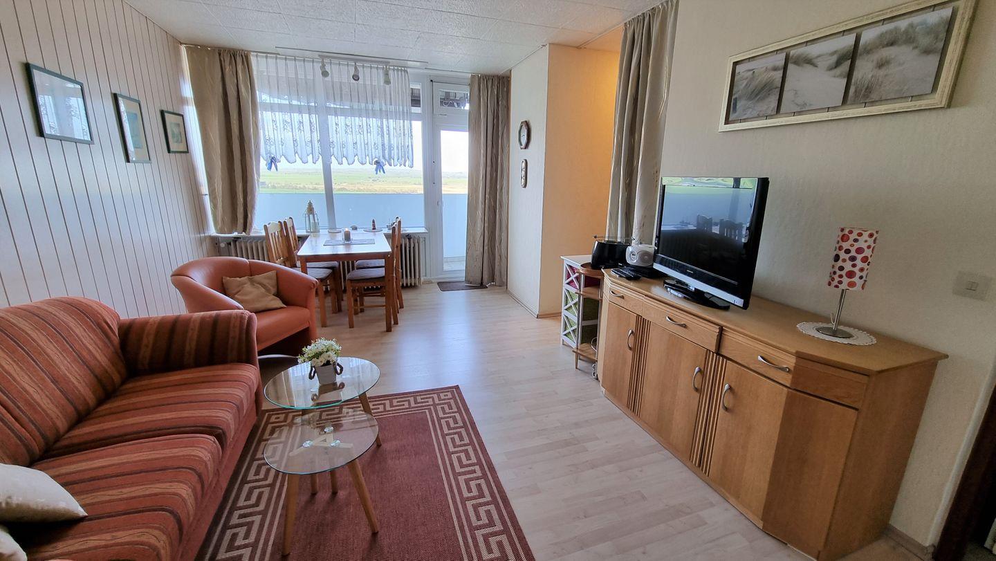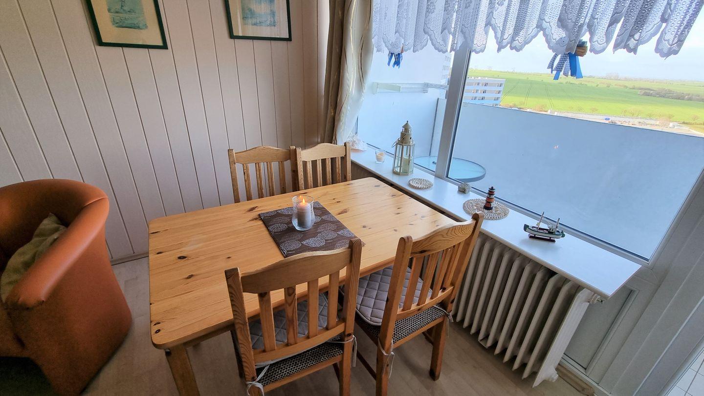 Der Wohnbereich ist mit Laminat, 3-Sitzer und 2 Sesseln sowie Tisch, 81cm Flachbild-TV, BlueRay-Player, Radio und CD-Player ausgestattet. Der gemütliche Essbereich befindet sich direkt am Fenster und von hier aus haben Sie den ganzen Tag über einen herrlichen Ostseeblick.