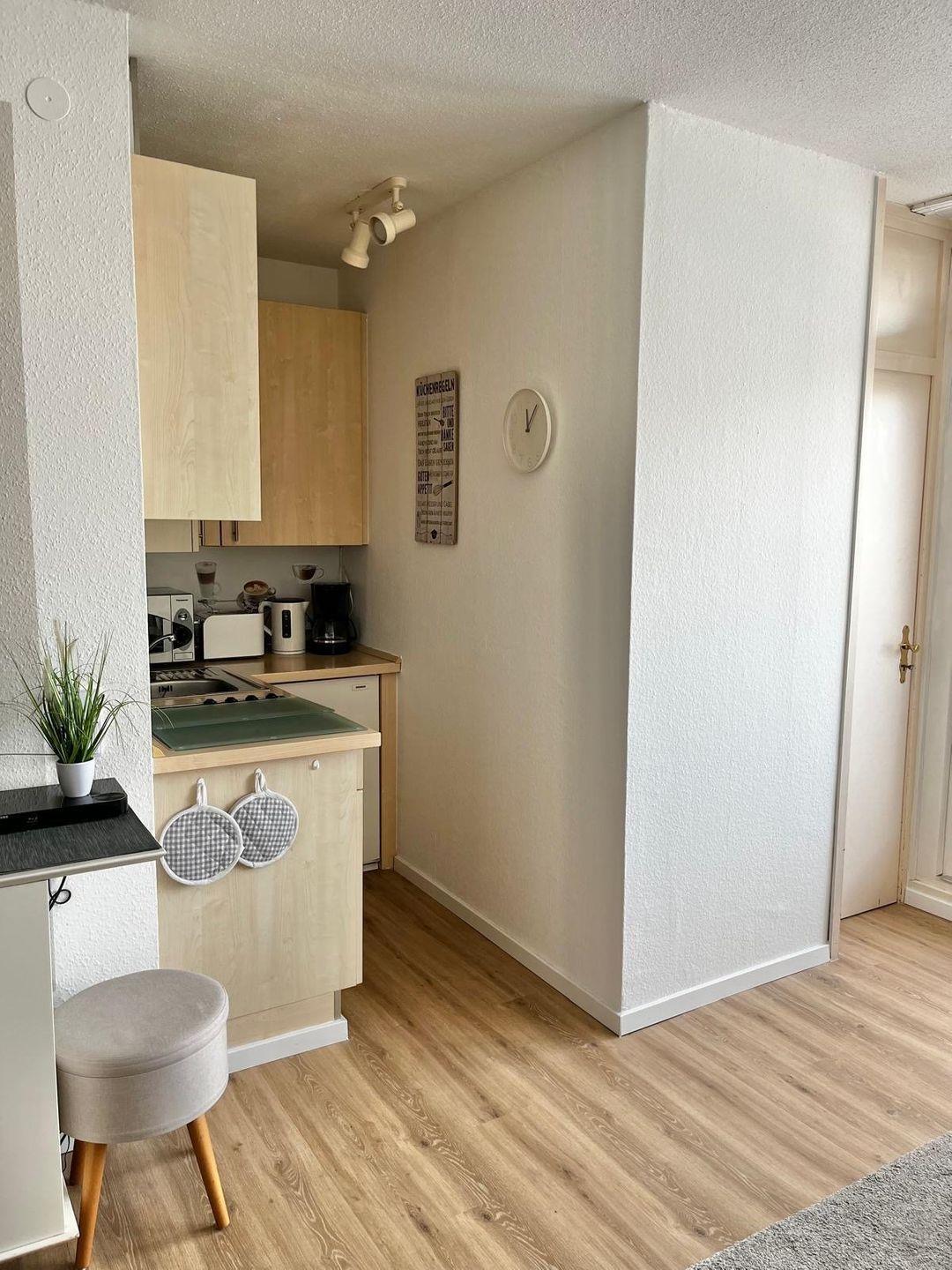 Die Kochnische ist mit modernen Geräten gut ausgestattet, darunter ein Ceran-Herd, eine Mikrowelle, ein Kühlschrank, Kaffeemaschine, Wasserkocher, Toaster und diverse Küchenutensilien sowie Geschirr und Besteck. So können Sie sich unkompliziert selbst versorgen. Der Balkon mit Gartenmöbeln lädt zu entspannten Stunden an der frischen Luft ein.