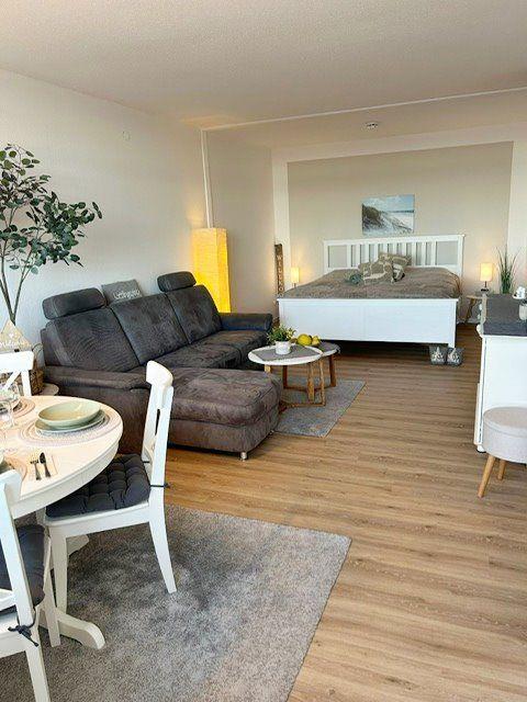 Die Wohnung besteht aus einem kombinierten Wohn-Schlafbereich mit bequemem Doppelbett im Schlafbereich. Im Wohnbereich sorgt eine bequeme Sofaecke für Behaglichkeit, während der Essbereich am Fenster zum gemeinsamen Speisen einlädt. Ein Flachbild-TV ist natürlich ebenfalls vorhanden. Fenster mit Sichtschutz bieten Privatsphäre, während Sie vom möblierten Balkon den tollen Ausblick genießen können.