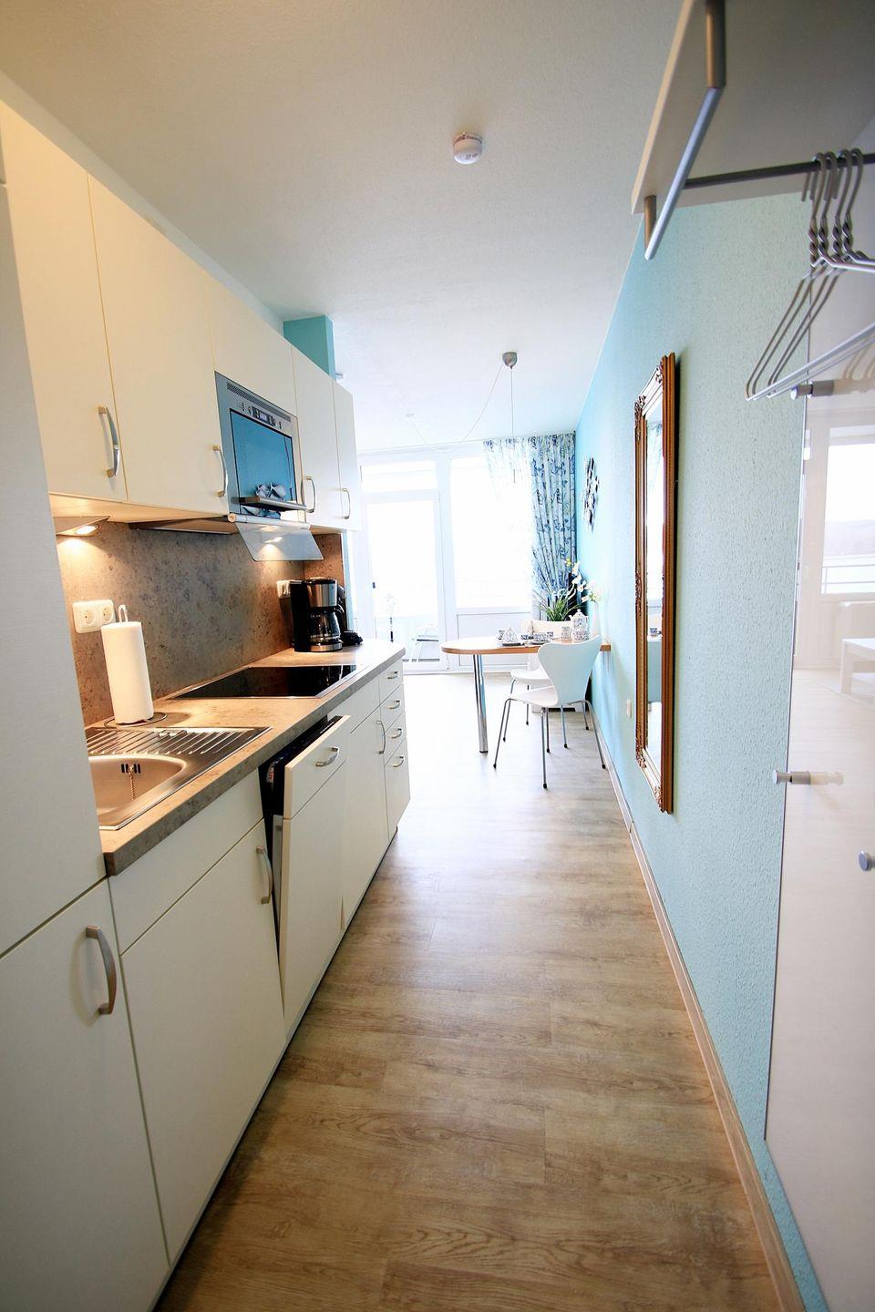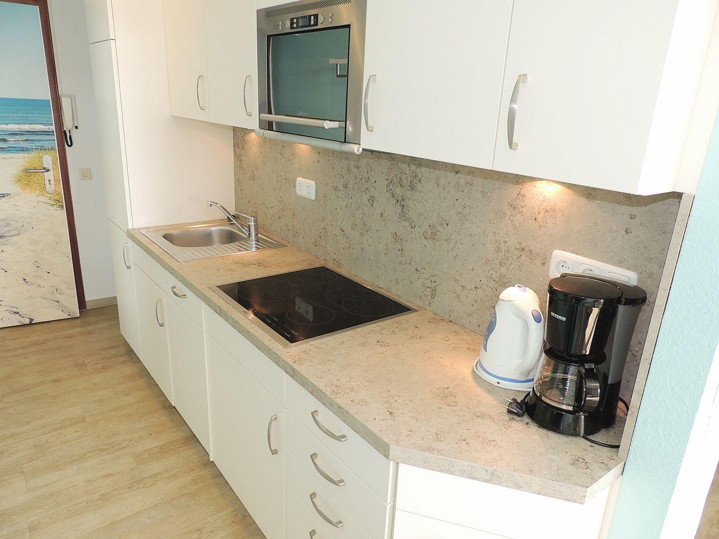 Küchenzeile mit 4-er Ceranfeld, Kombi-Mikrowelle, Kühl-Gefrierkombination, Kaffeemaschine (Senseo) und Geschirrspüler.