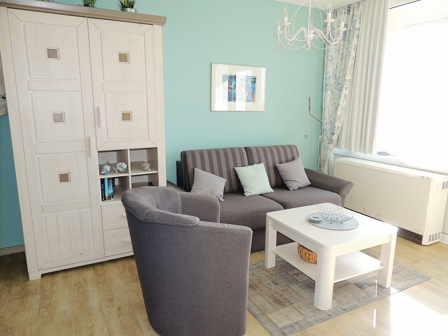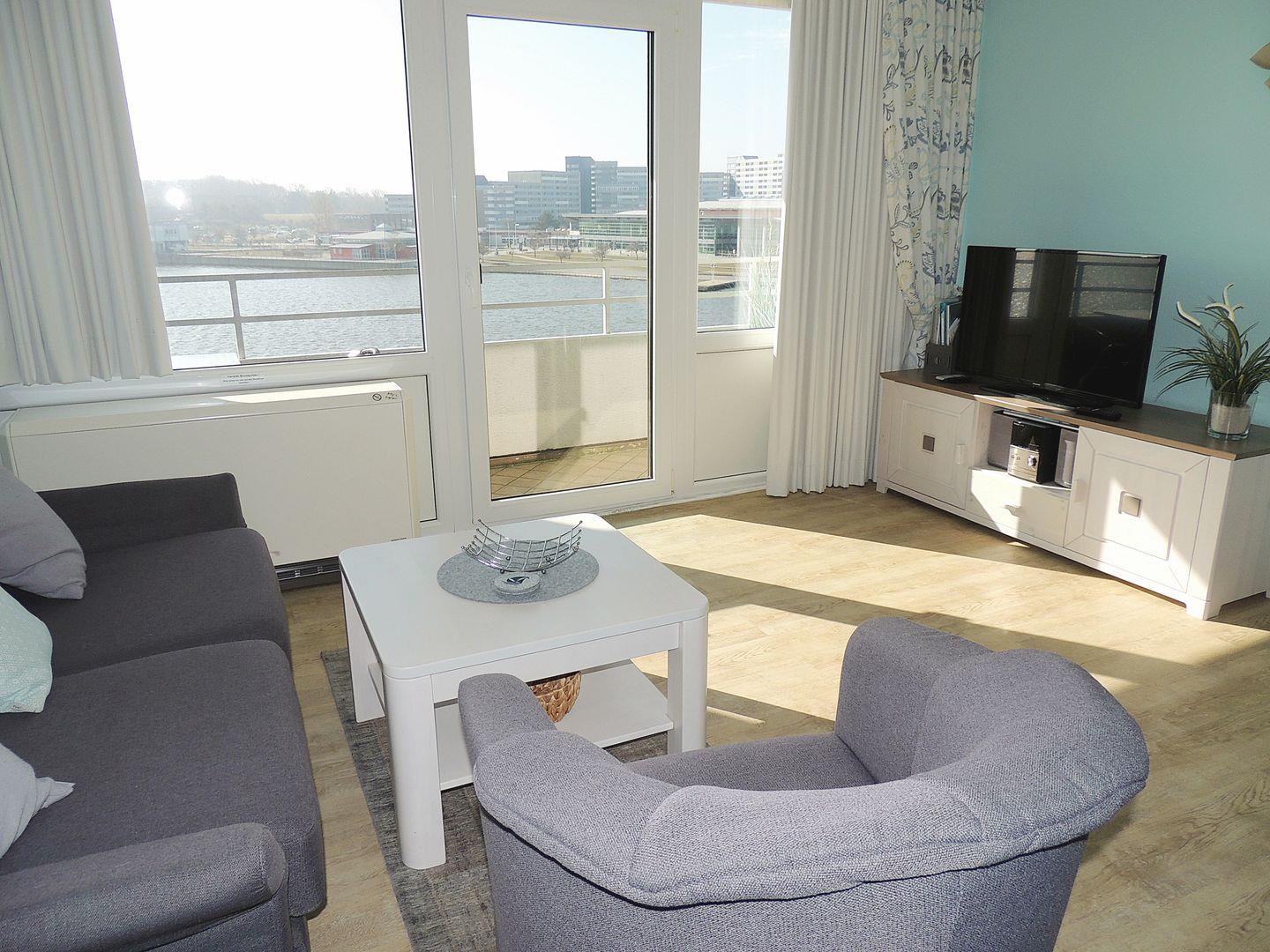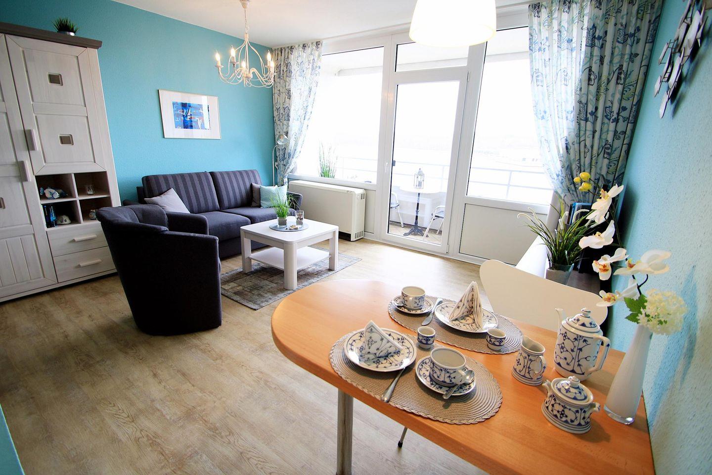 Helle und harmonisch aufeinander abgestimmte Ferienwohnung in der 4. Etage mit Balkon zur Südseite und Blickrichtung über den Binnensee.