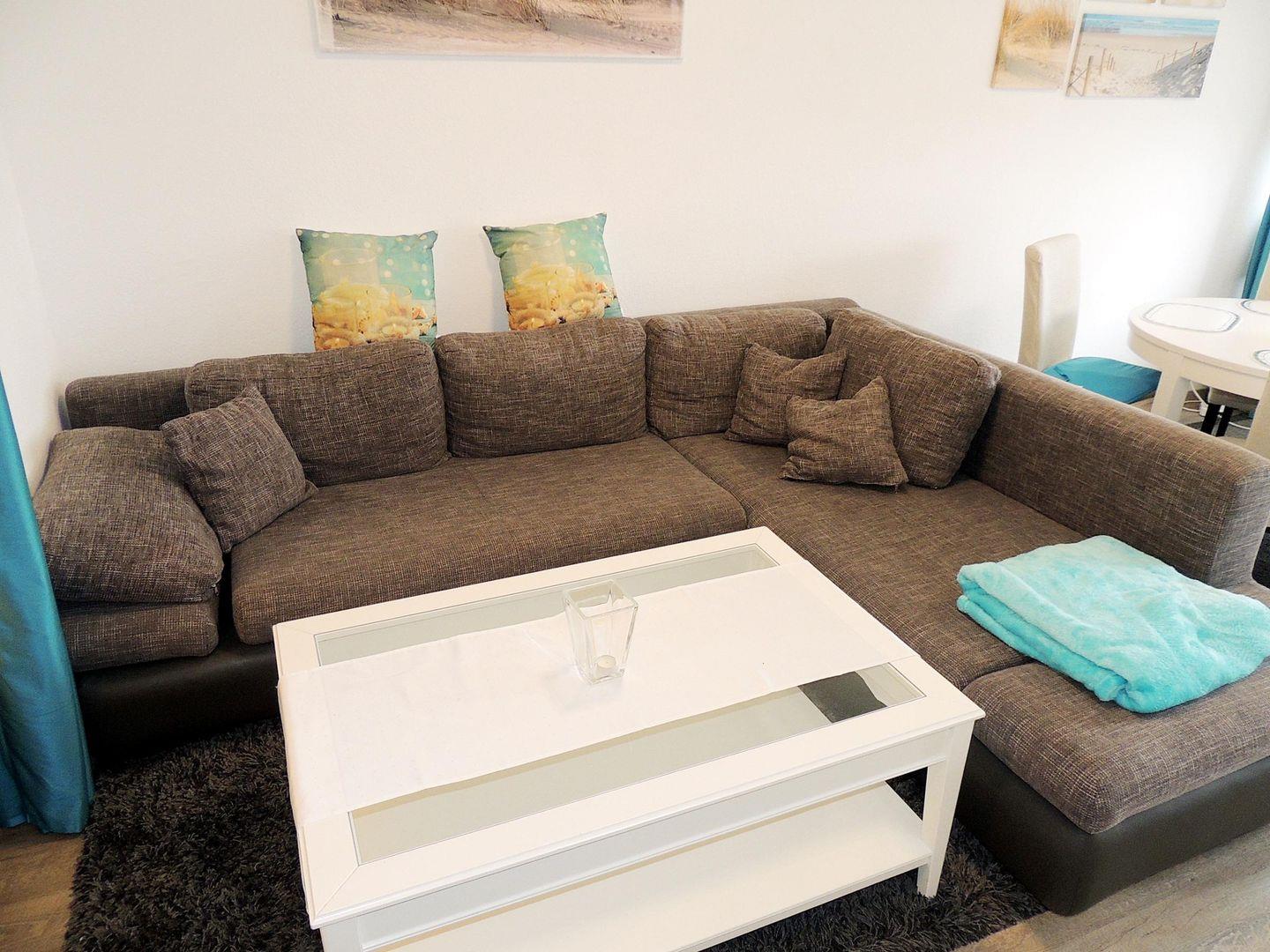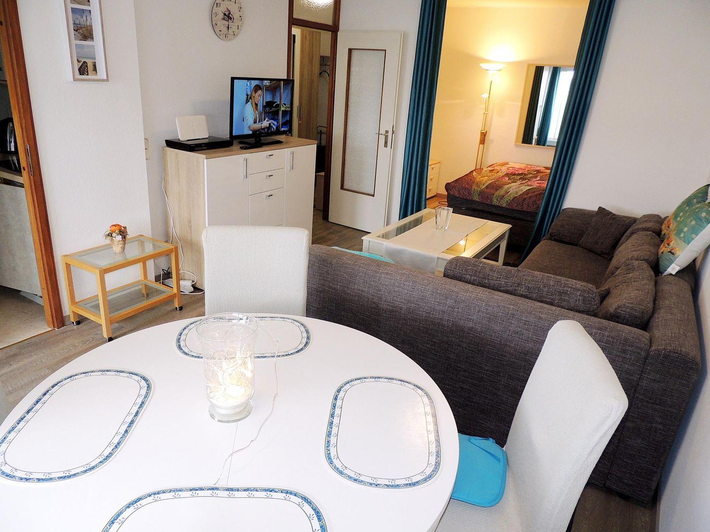 Der Wohnraum ist ausgestattet mit einer gemütlichen Couch in L-Form, einer kleinen Kommode mit einem 80cm-Flachbild-TV, einem Blueray-Player und einer runden Essecke.