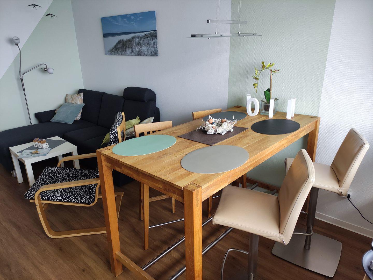 Der Wohnbereich ist mit einer L-Couch zum Verweilen eingerichtet. Der integrierte, direkt am Fenster befindliche Essbereich läßt Sie am hohen Esstisch mit Barhockern direkt über auf die Ostsee schauen.