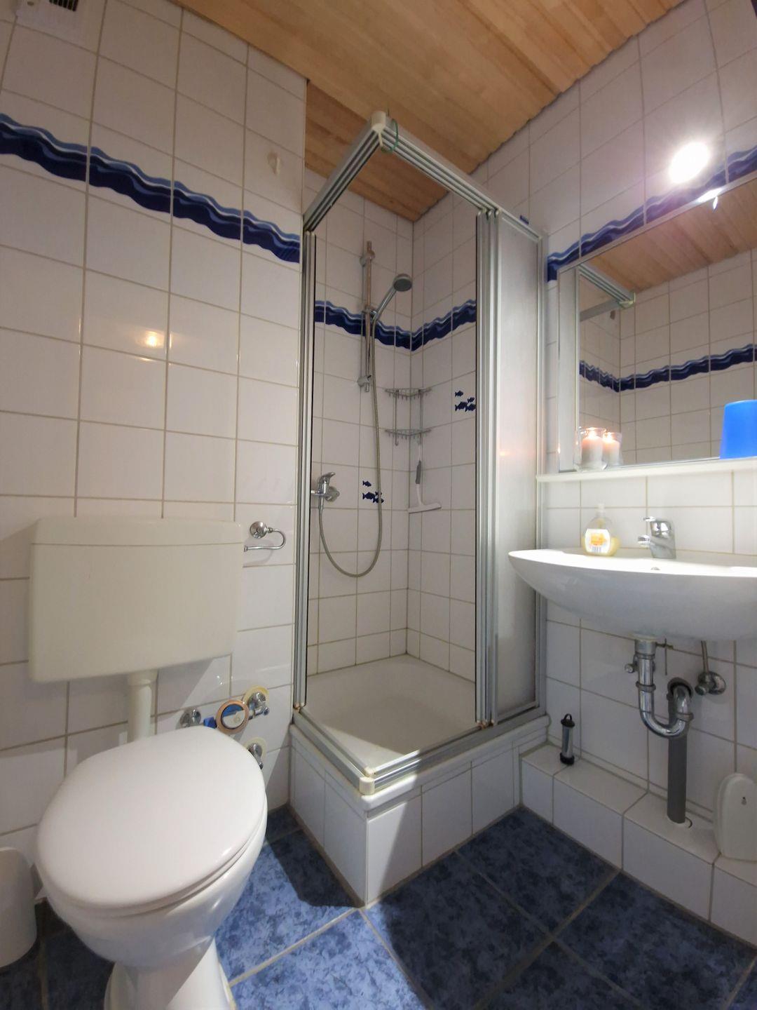 Badezimmer mit Dusche und WC.
