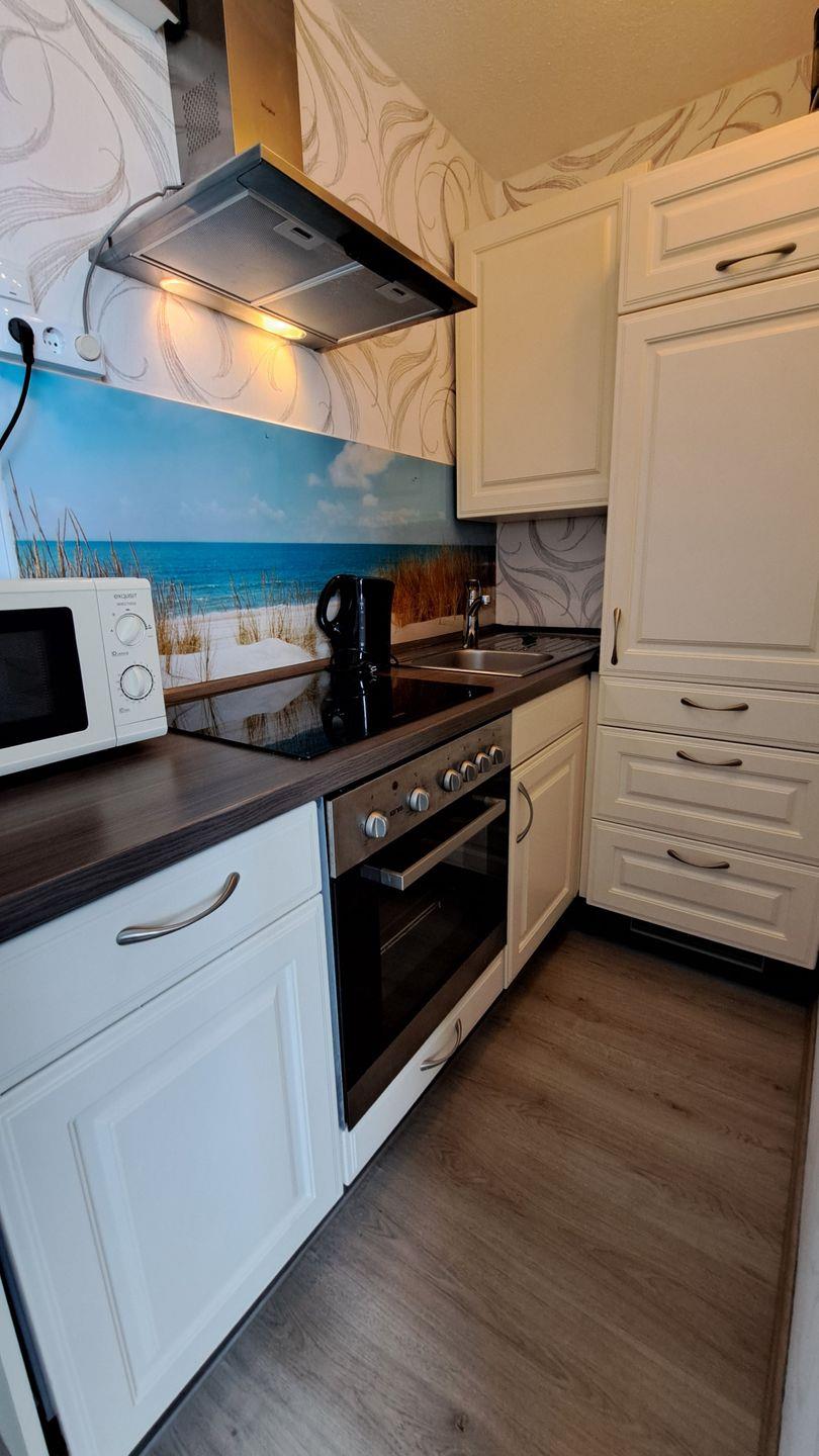 In der Küche befinden sich ein 4-Ceranfeld, Backofen, Mikrowelle, Kaffeemaschine und Kühlschrank mit Gefrierfach sowie eine Geschirrspülmaschine.